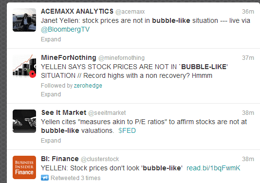It’s enough to make a rational person weep. So in the same morning, we see the albino troll announce that stocks are not “bubble-like” (whatever the hell that is supposed to mean):