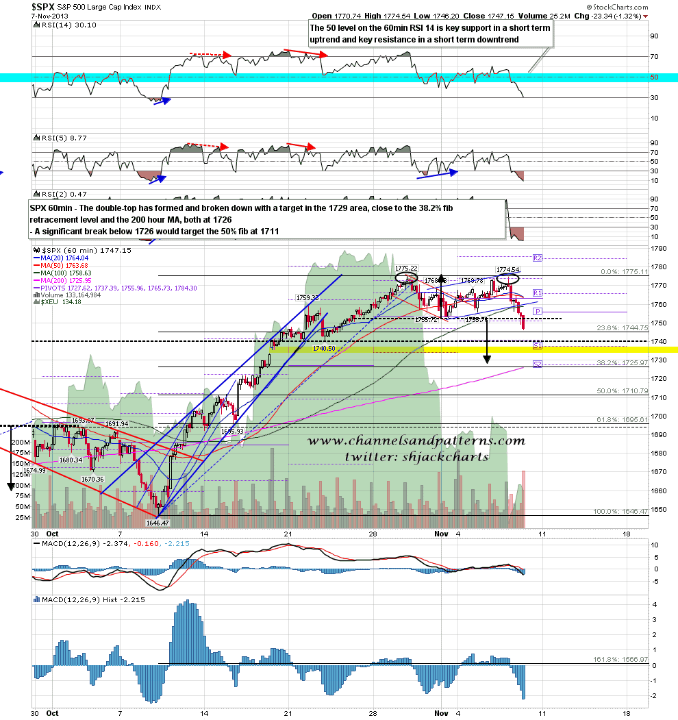 Assuming that level can be taken out, the first retracement target is at 1729 SPX at the double-top target. That is very close to the 38.2% fib retracement level at 1726. SPX 60min chart: