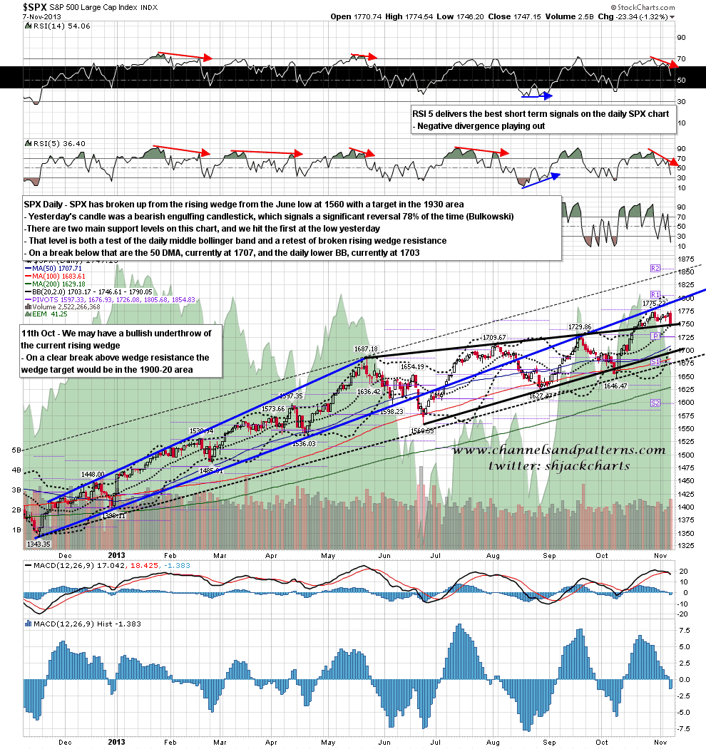 Yesterday saw SPX test the last high to form a perfect double-top and then strong rejection there to deliver a daily bearish engulfing daily candlestick. That is a very bearish candle but needs to followed through shortly, and I would note that I have a possible failure level for this reversal at the low yesterday. That failure level is at the SPX daily middle bollinger band and broken rising wedge resistance from the 1560 low, and bears will need to break underneath that to deliver the main retracement targets here. SPX daily chart: