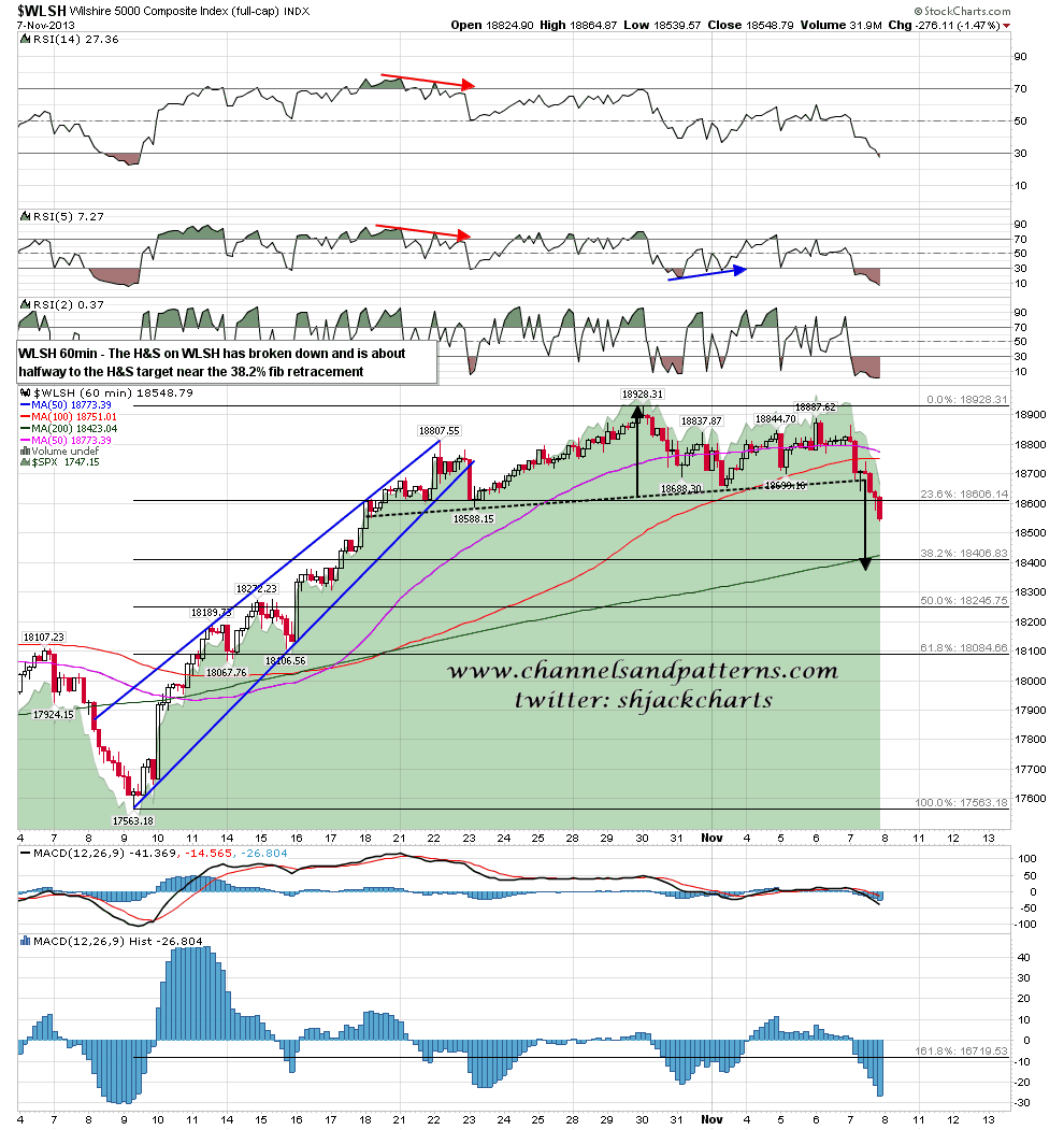 What else can we use as a guide here? Well the failure of the IHS on RUT was the first warning of this reversal, and as there is now a clear declining resistance trendline on RUT from the high there I’m planning to watch that for a warning signal if the decline on SPX is too fast to develop one there. The RUT chart is relatively very weak and if SPX hits the 50% fib retracement target it is possible that RUT may have retraced 1005 of the previous move by then. RUT 60min chart: