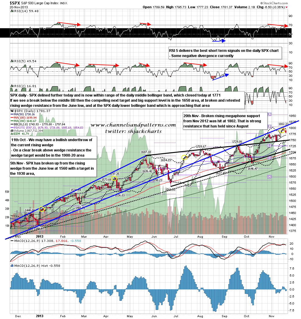 If we do see a break downwards today, I mentioned that the wedge target would be in the 1765 SPX area, a decent fit with a test of the daily middle bollinger band at 1771. The support level to watch however would be the 1650 SPX level, at the broken rising wedge resistance trendline from the June low that was retested at the last low. That would be a decent fit with the daily lower bollinger band which will soon hit the 1650 area, and is in my view the key resistance level below. As long as the bulls can hold the 1750 area they remain in control. if the 1750 SPX area is lost then a lot of potential downside will open up. SPX daily chart: