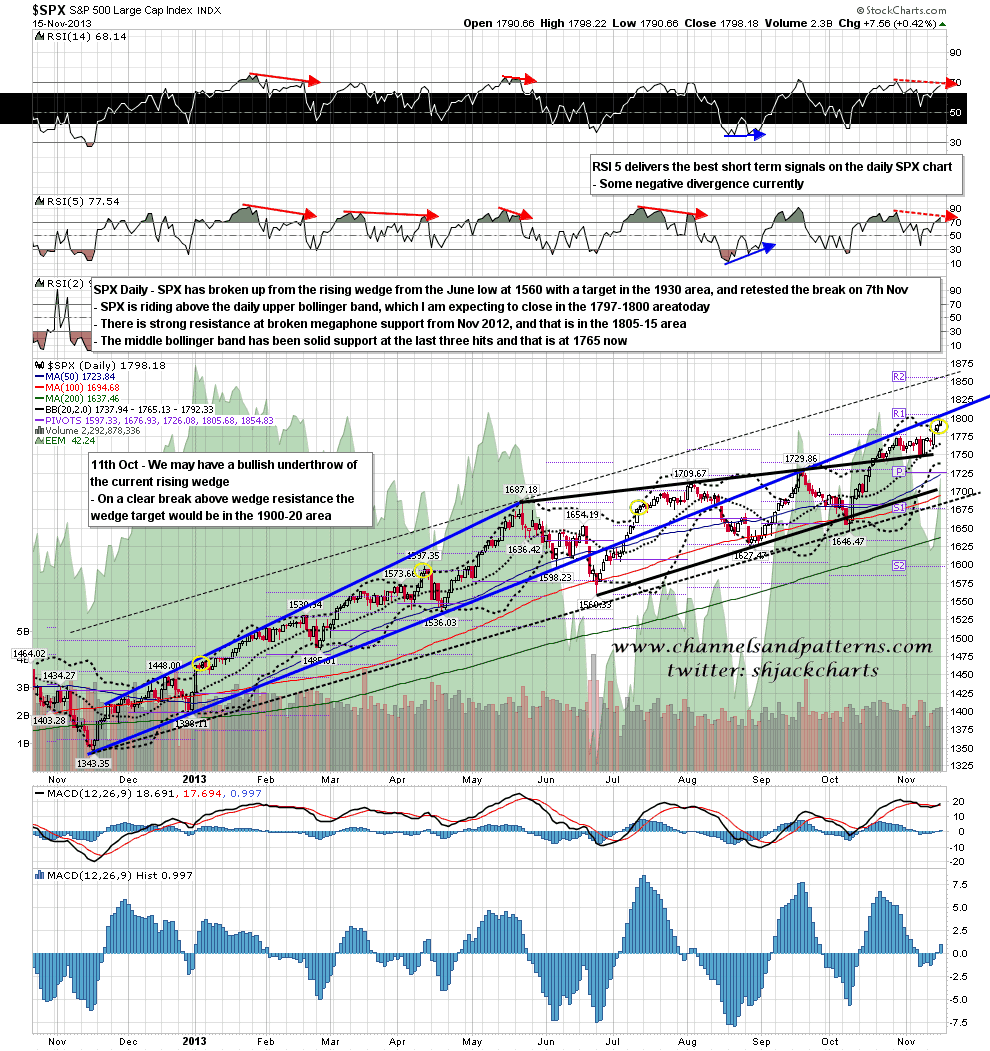 The second trendline in that area is broken rising megaphone support from November 2012. That held the high in September at a retest and the October high was just short of another retest. I have that in the 1805-15 area this week. I will also mention that SPX is riding above the upper bollinger band at the moment and I am expecting the band to close today in the 1797-1800 area today. SPX daily chart:
