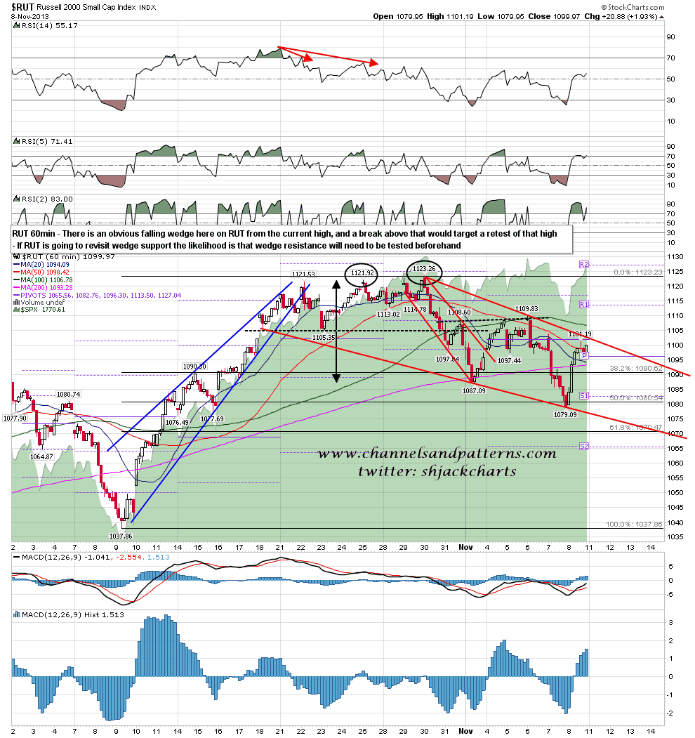 We may well see consolidation or retracement today, but I’d expect RUT at least to go a little higher before we saw a retracement. A falling wedge has formed there from the high and I’d expect a test of wedge resistance before a retracement that could then reach falling wedge support. A break over wedge resistance would target a retest of the current high on RUT. RUT 60min chart: