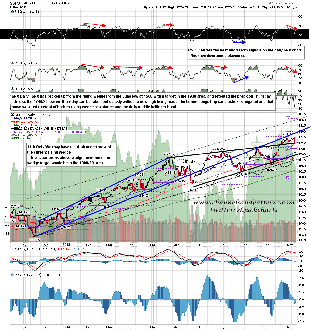 So what is the overall pattern setup here on SPX? Looking at the patterns from the October 2011 low there are three patterns from there which may all be part of a larger rising channel. If we aren’t going to see a move to channel support, which I’ve been considering as a possibility since the Spring high but shows no sign of happening so far, then strong support is now at broken wedge resistance at the low on Thursday and there are two open rising wedge targets above in the 1930 and 1965 areas. In my experience large rising wedges are a lot better at making upside than downside targets and I can’t see any obvious reason to think that those targets won’t be made. Given the short term setup I would take a break to new highs here as most likely being the start of a move towards those targets in the next few months. SPX daily chart from Oct 2011: