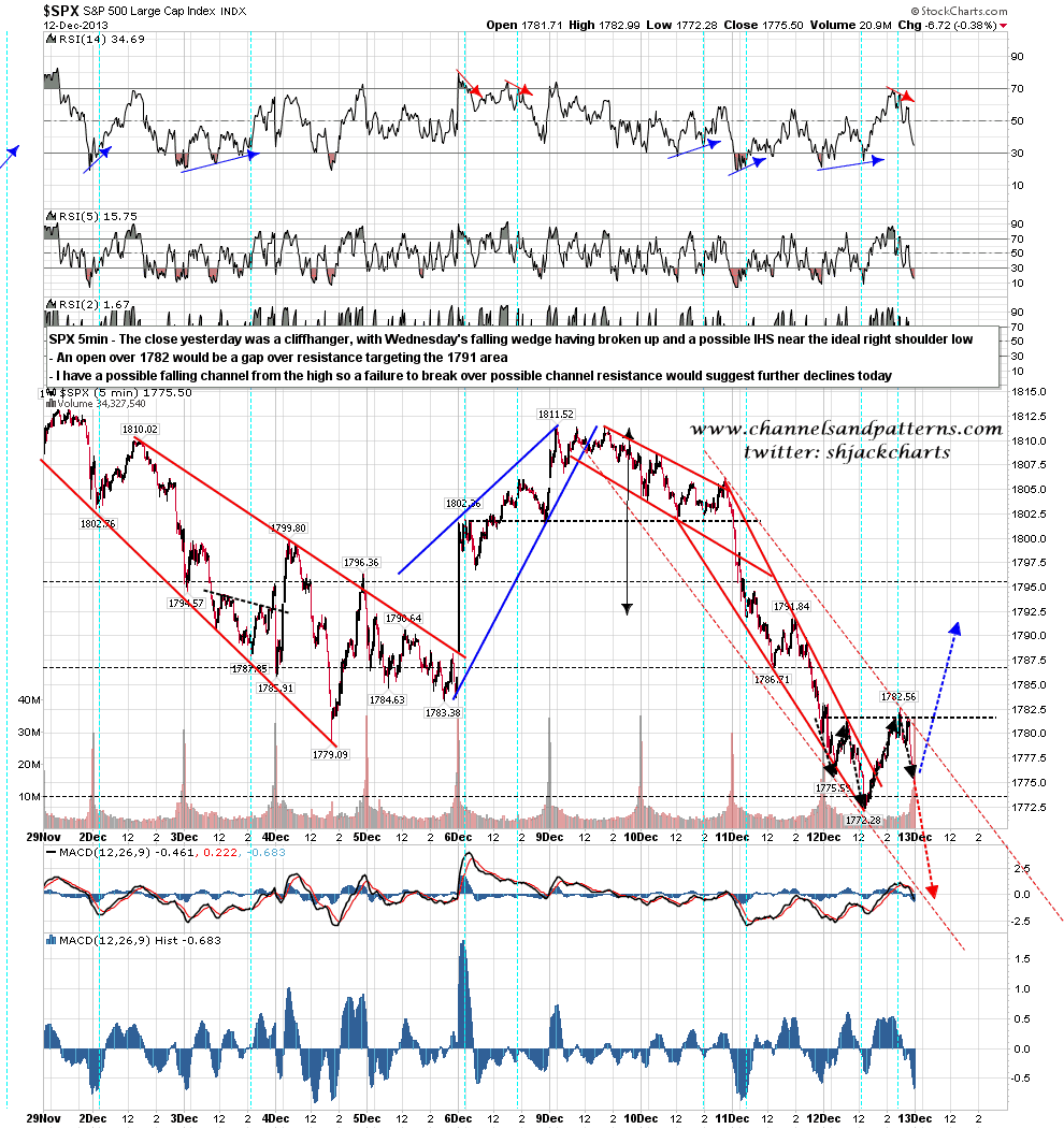 The equivalent of this bull setup on the SPX 5min chart is the falling wedge that I posted on twitter yesterday before and after it broke up, and the possible IHS forming after the initial rally from the wedge break. The close yesterday was close to the ideal right shoulder low on that IHS and an open over 1782 would be a gap up over resistance targeting the 1791 area. SPX 5min chart: