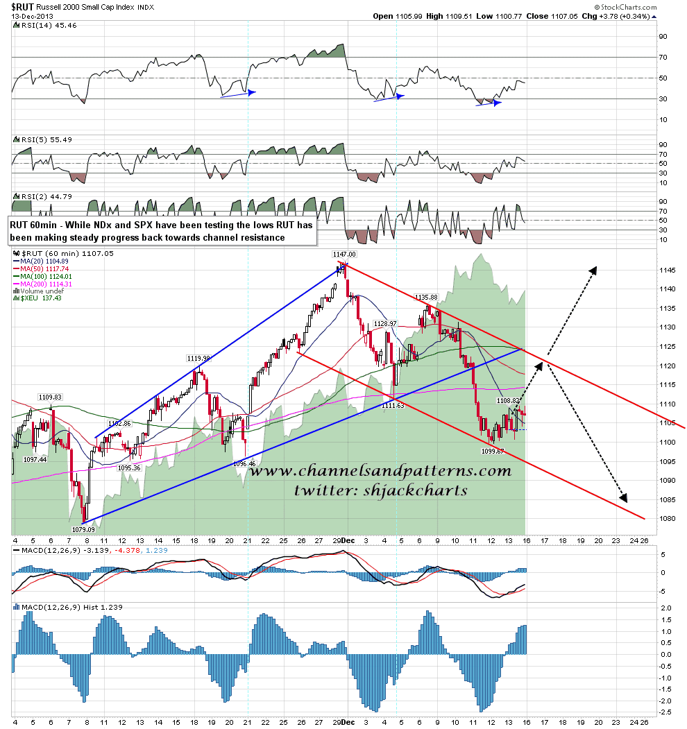 I’m currently working on the assumption that this is a rally within a downtrend, and apart from watching to see whether resistance at the daily middle bollinger band on ES and SPX holds, I’m also watching RUT and NDX which have clear targets that should not be exceeded if this is just a rally. On RUT I’m looking for a test and reversal at declining channel resistance in the 1122-4 area. A break over the channel would obviously be a strongly bullish signal. RUT 60min chart:
