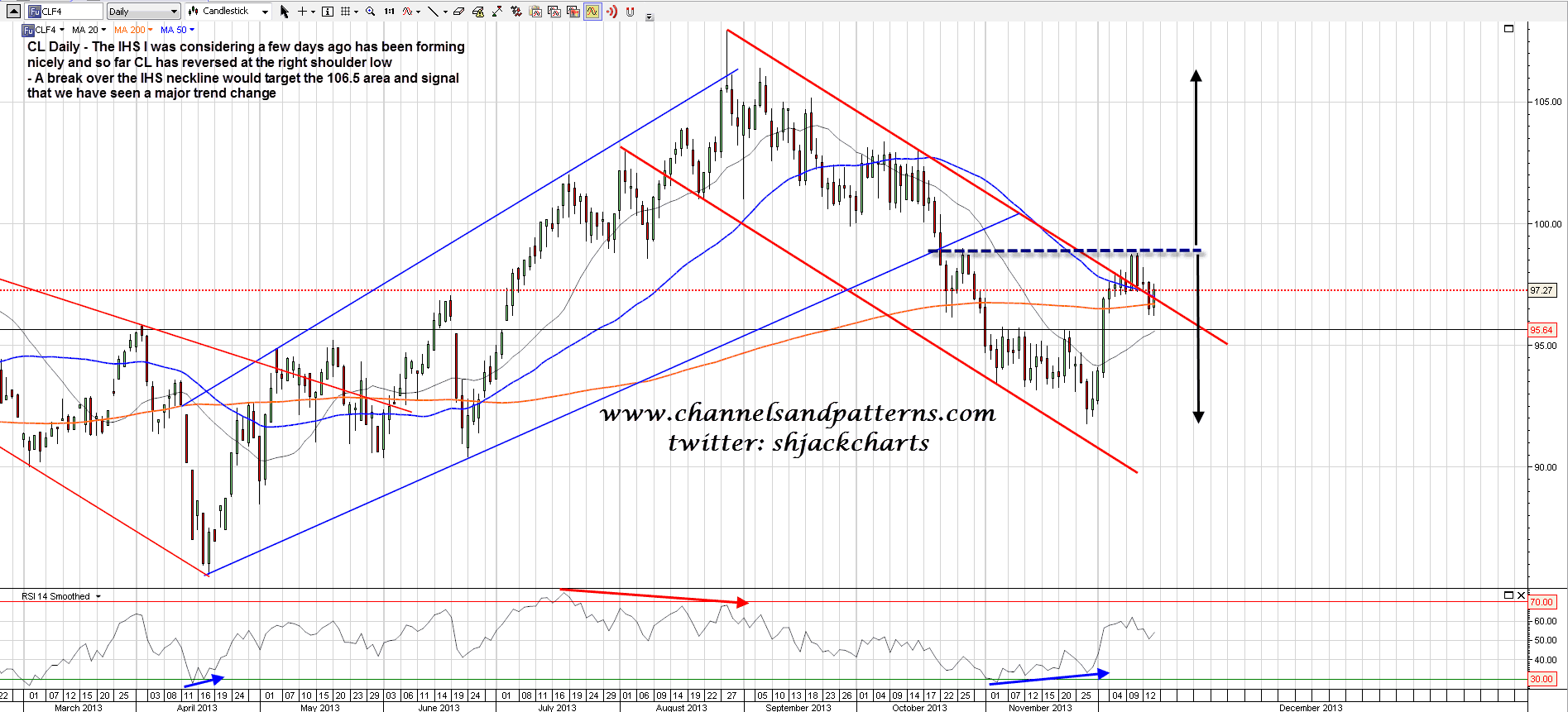 On other markets the IHS right shoulder that I suggested a few days ago might form on CL has reached the ideal right shoulder low and reversed there. If this pattern should now break up I would have a target in the 106.5 area. CL daily chart: