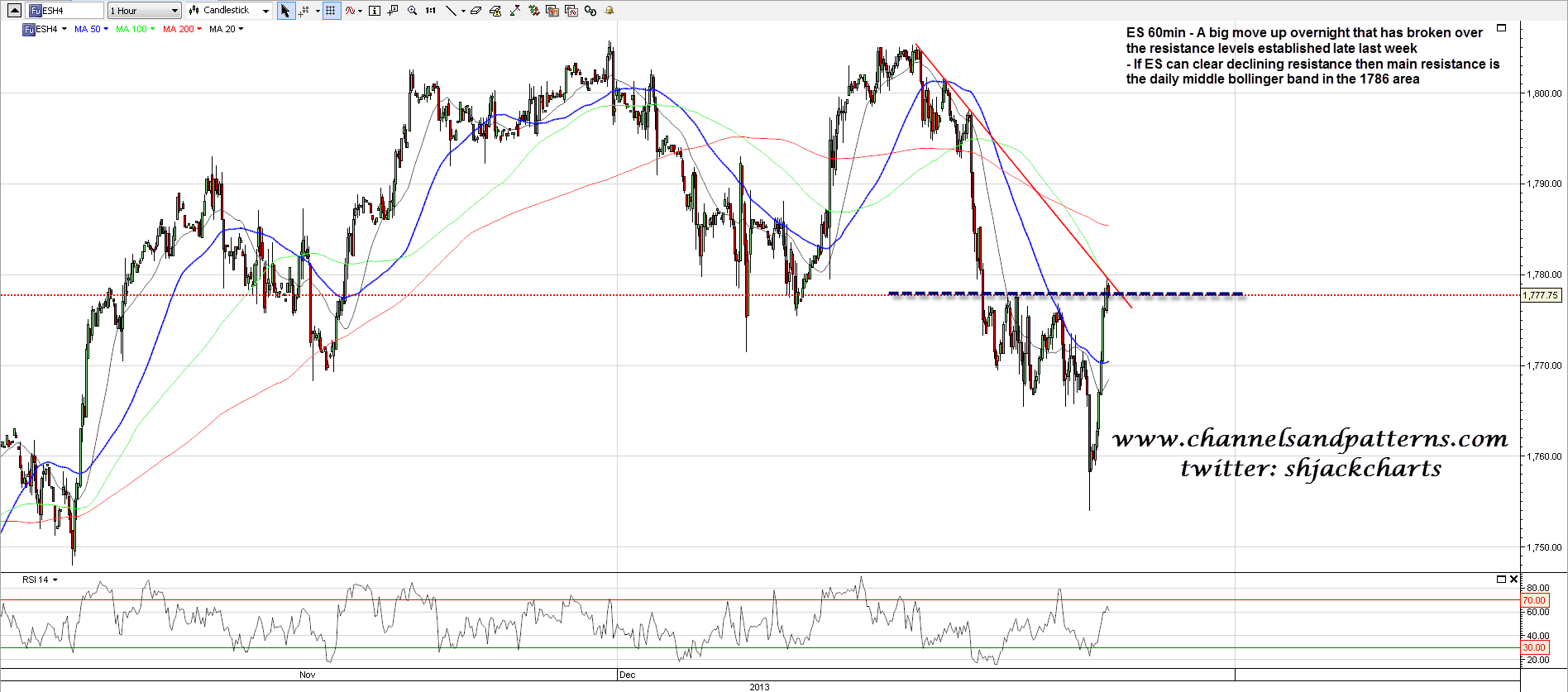 The overnight action has been wild, with a spike down to 1754 (March ES) on the disappointing China PMI numbers, and then a wild 25 handle rally up to 1779.50 so far. I have ES testing declining resistance from the high there, and if that is broken then main resistance is the daily middle bollinger band in the 1786 area. ES 60min chart: