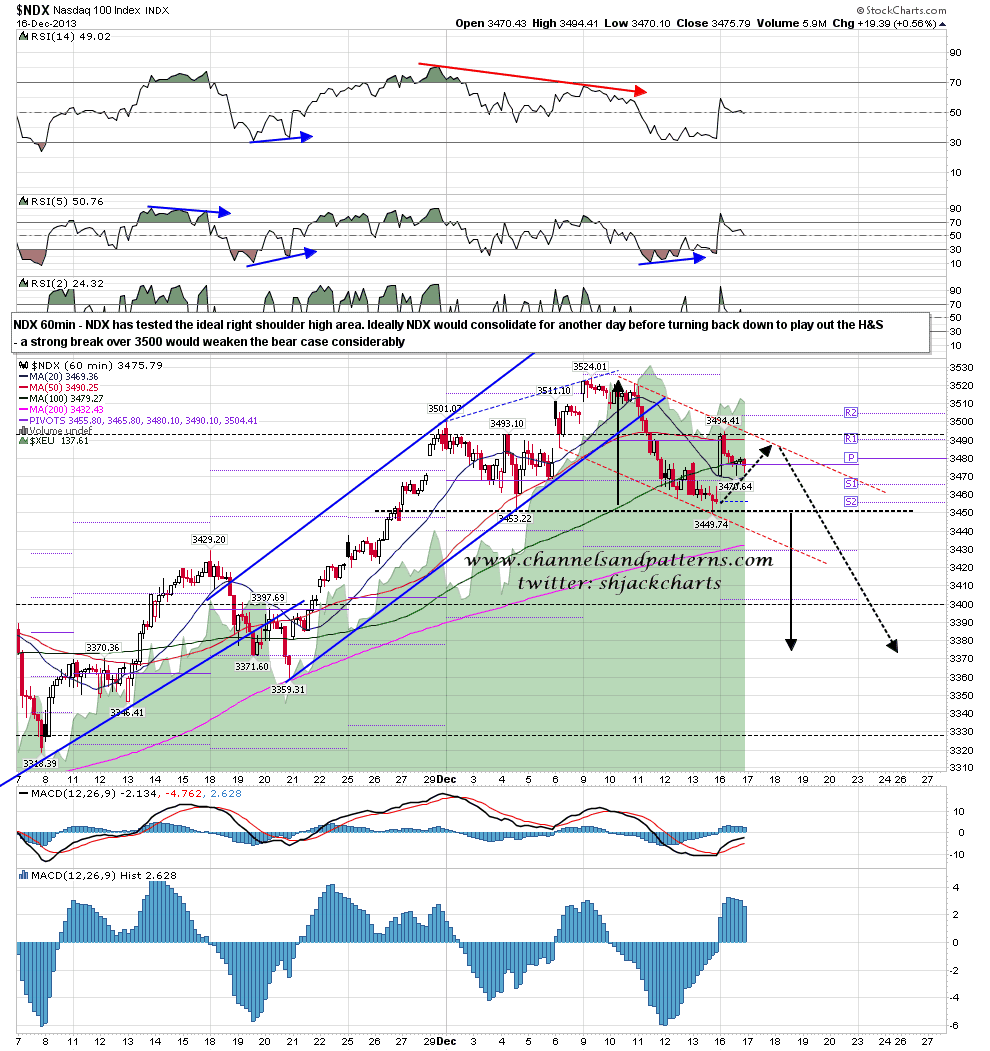 I gave the ideal right shoulder high area on NDX yesterday morning as the 3500 area and the opening high was 3494.41. For symmetry I’d normally expect another day or so of consolidation, but that’s high enough for the right shoulder. A conviction break above 3500 would be a bullish signal here. NDX 60min chart: