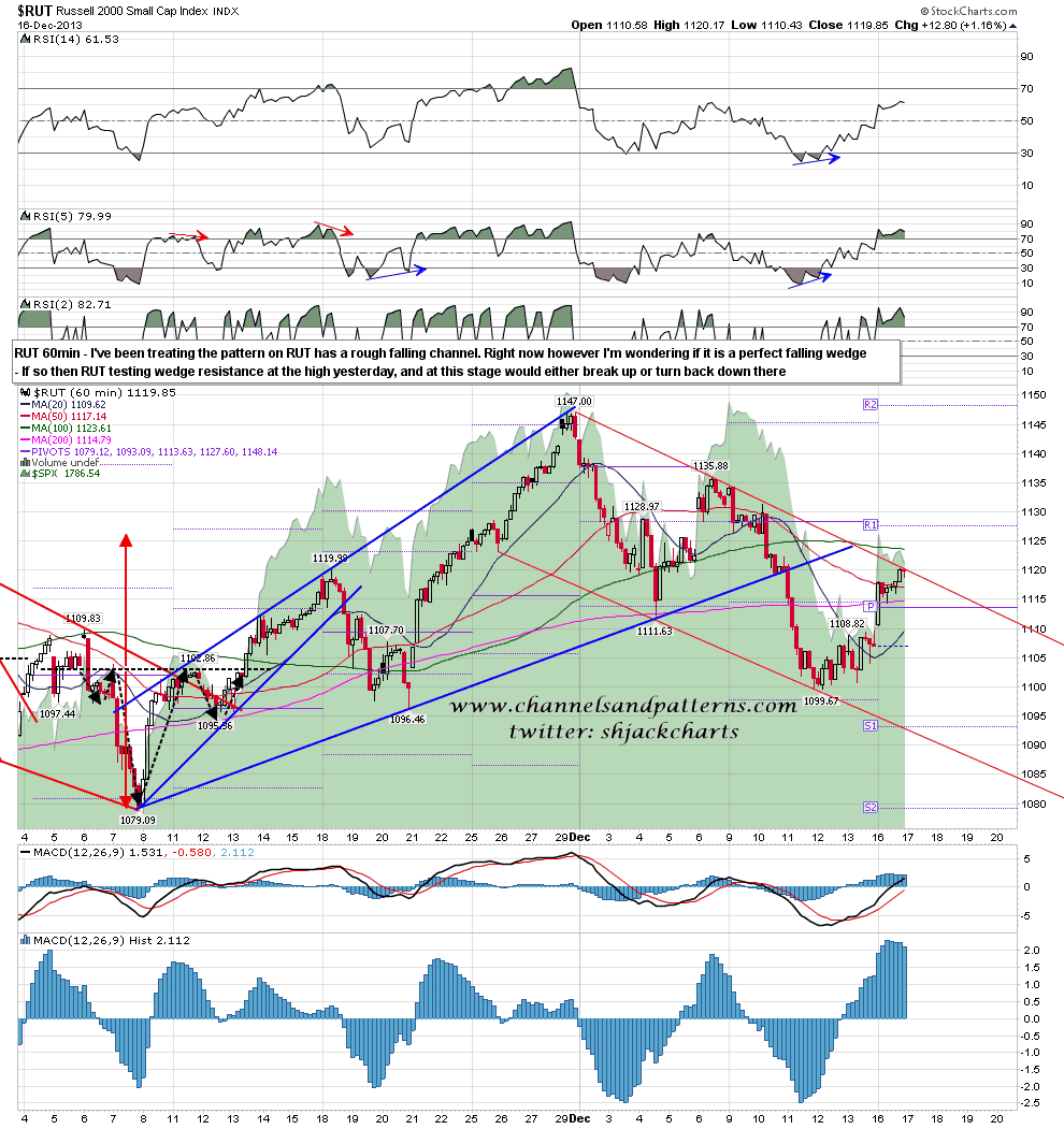 I’ve been treating the setup on RUT as a rough falling channel, but I think this is most likely instead a perfect but gently narrowing falling wedge. If so then the rally high there was also hit yesterday and a break up from this wedge would also be a strongly bullish signal. RUT 60min chart: