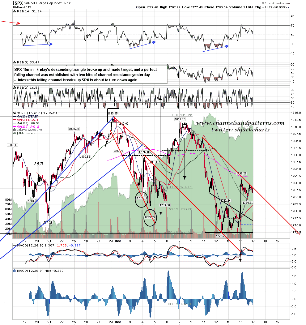 On the SPX 15min chart there is now a perfect falling channel from the last highs with three trendline hits above and below. This setup was strongly confirmed with two hits yesterday and this trendline is the key resistance here on SPX in my view. SPX 15min chart:
