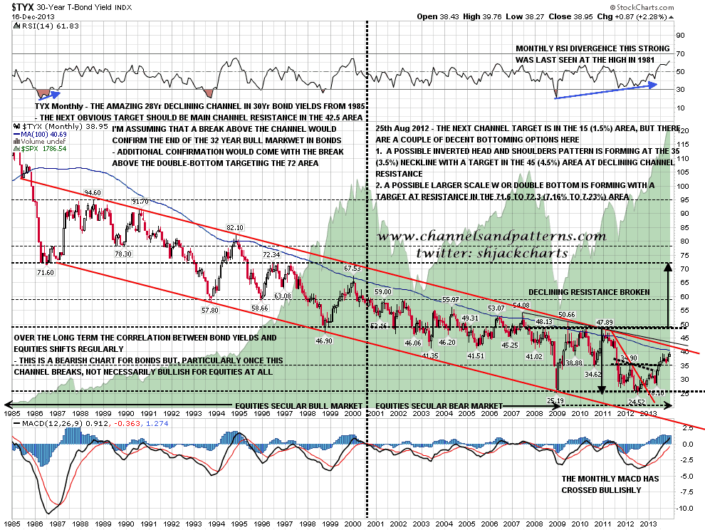 Not much of importance has been happening on bonds and precious metals recently, as we are close on both to very significant longer term levels, but haven’t hit them yet. On bonds the 30 year bond yield (TYX) is nearing channel resistance on my declining channel from 1985 and a break above would be a strong signal that the bull market on bonds since 1980 has at last finished. Equally a strong reversal there would signal the opposite. TYX monthly chart: