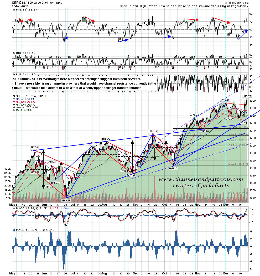 On the SPX 60min chart there’s nothing to suggest that a reversal back down is imminent and I have a possible rising channel in play that would target a hit of channel resistance in the 1840s. That would be a decent fit with main resistance overhead at the weekly upper bollinger band, currently at 1847. SPX 60min chart: