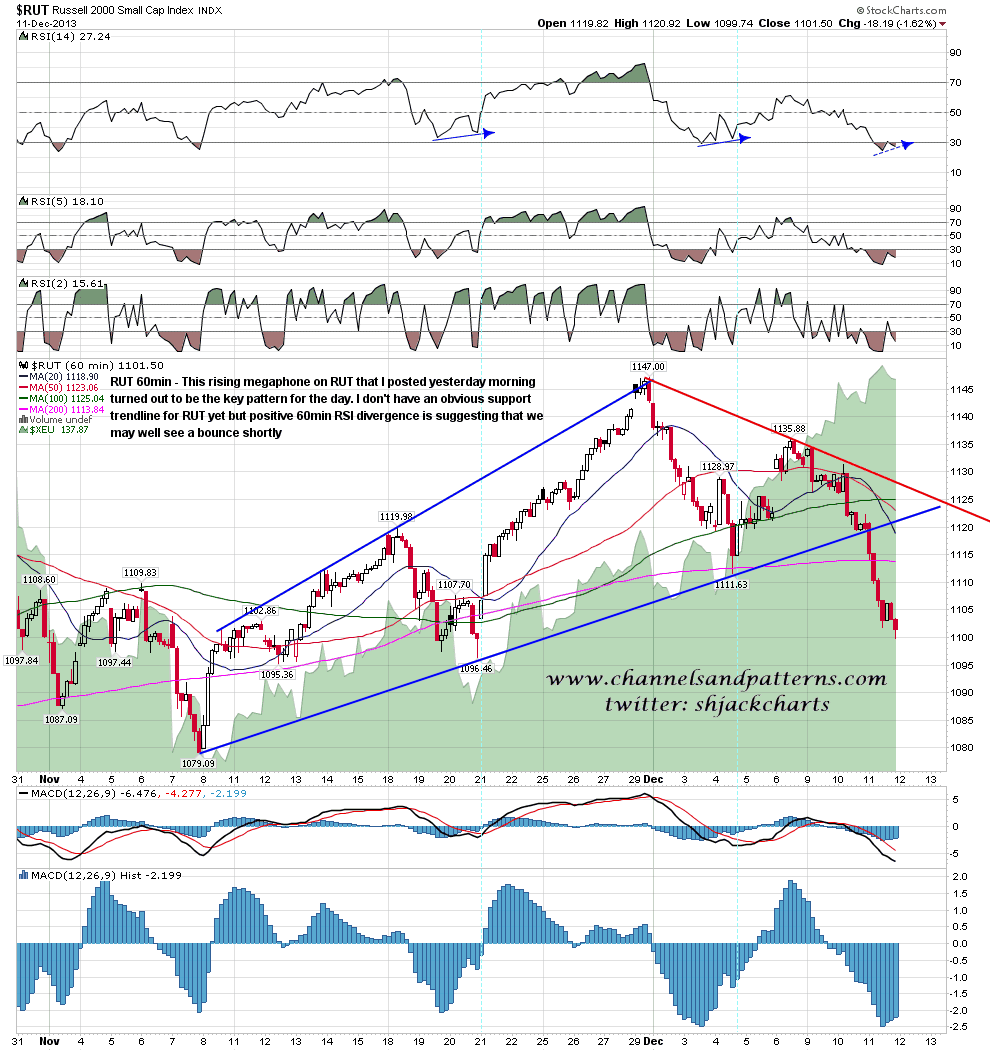 The rising megaphone on RUT that I posted yesterday morning turned out to be the key pattern of the day as equities melted down after that megaphone broke at the open. I don’t have a pattern for the decline yet but the positive divergence on the 60min RSI is suggesting that a bounce may be close. if we see that the obvious target would be declining resistance in the 1127 area. RUT 60min chart: