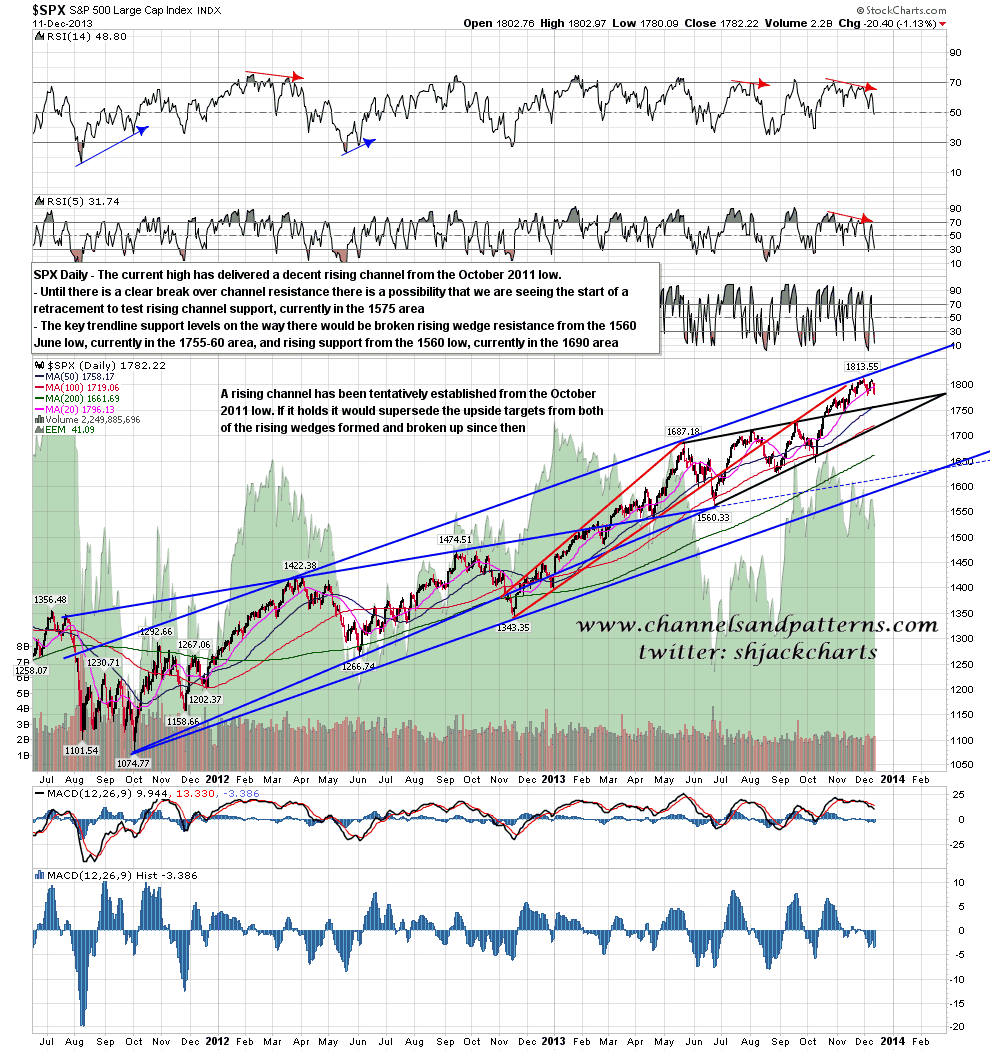If we are to see that large retracement over the next few weeks and months, that would be in the context of a large rising channel from the October 2011 low that was established at the 1813 high. The channel target would be at rising channel support, currently a little under 1600 and not far from the weekly lower bollinger band. Important support levels to note on the way would be broken rising wedge resistance in the 1760 area and rising support from the 1560 area, currently in the 1690 area and a decent fit with my theoretical H&S target and the 200 DMA. SPX daily chart: