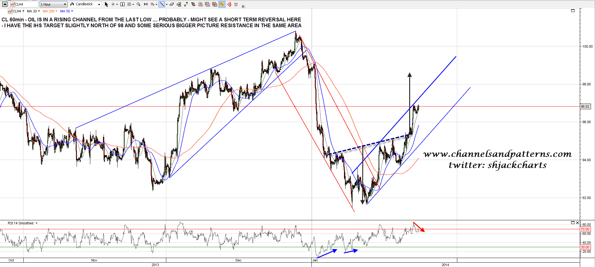 I have CL in a possible rising channel from the last low and looking a bit toppy short term. the IHS target is slightly north of 98 and I have strong bigger picture resistance in the same area. CL 60min chart: