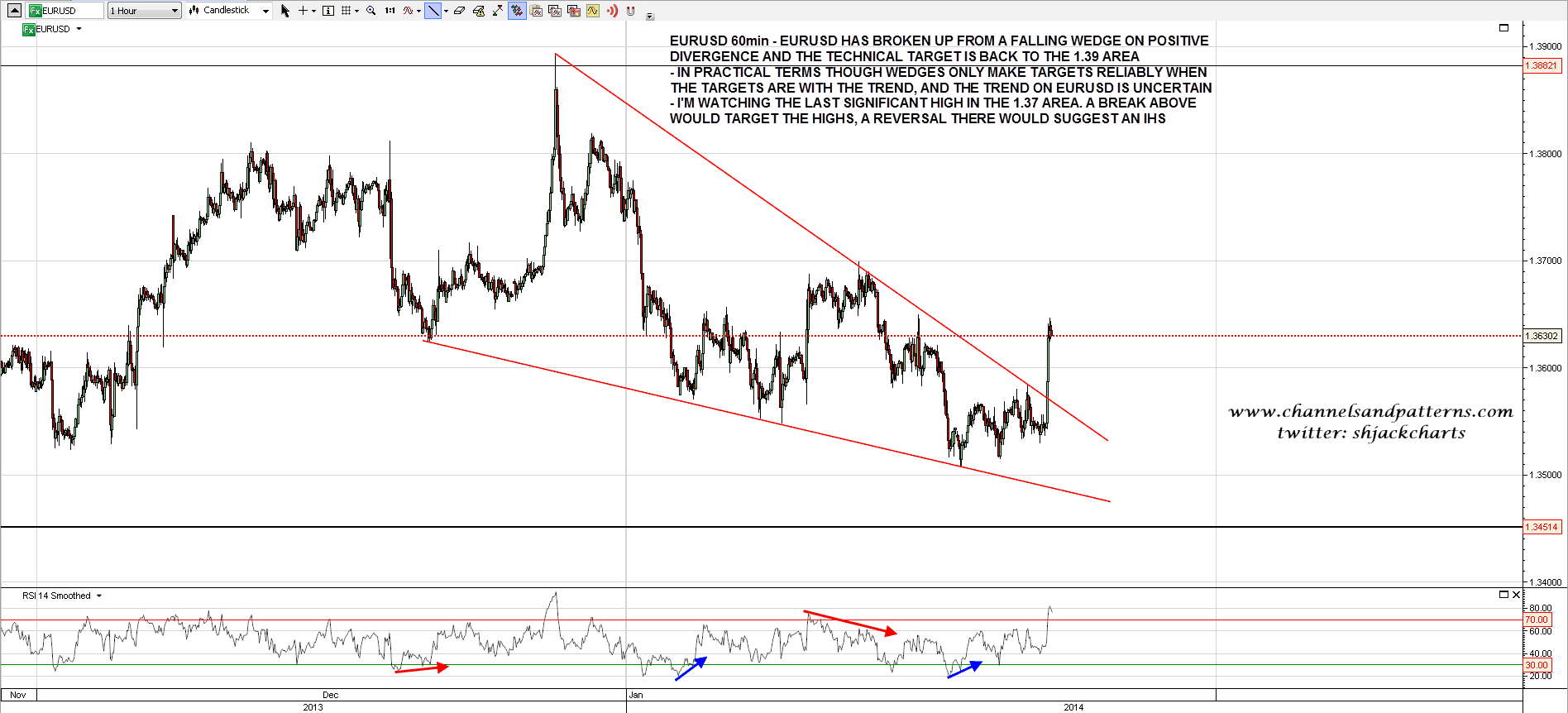 On other markets EURUSD has broken up from a falling wedge and while I’m thinking this is a counter-trend bounce I could be mistaken. I’m watching to see whether the last significant high at 1.37 is tested, and if it is, then I will have possible double-bottom and IHS options to look at there. EURUSD 60min chart: