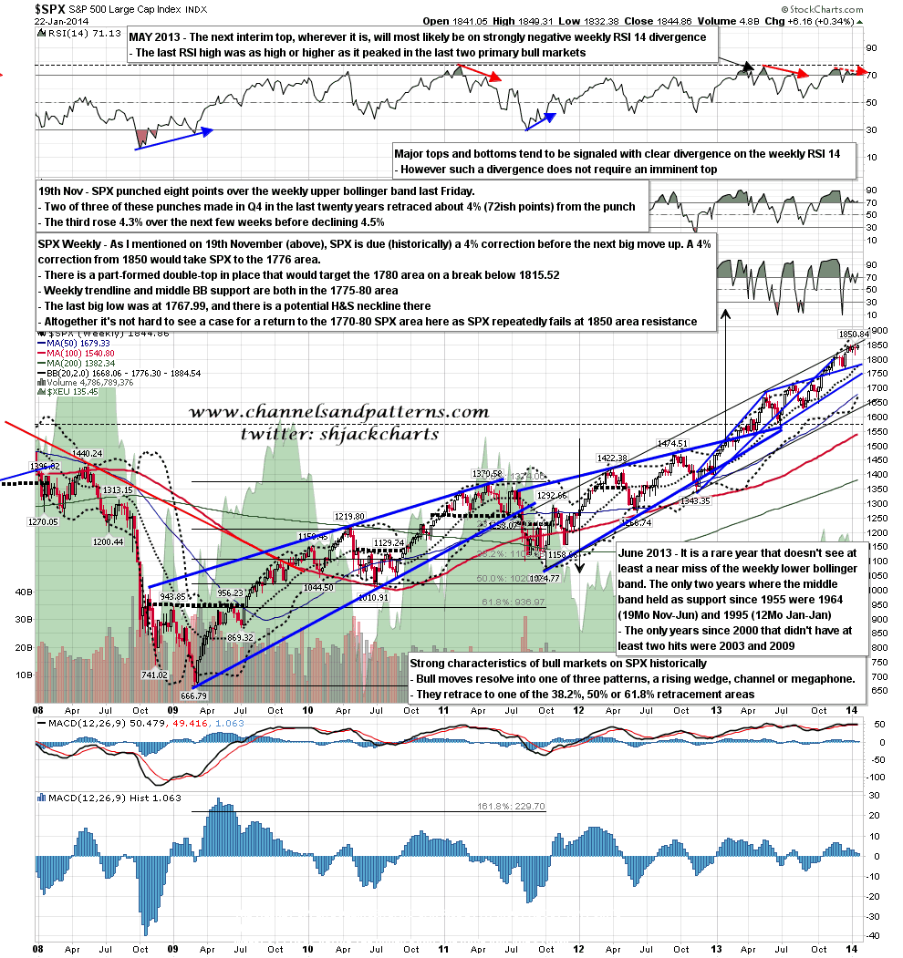 What if the range breaks down rather than up? I mentioned on 19th November after a rare punch up through the weekly upper bollinger band that historically there was a strong case for seeing a 4% retracement starting not too far above that punch. SPX was at 1800 at the time and if we were to see a 4% retracement from the current 1850 high that would target the 1776 area. I have decent trendline support and the weekly middle bollinger band in the 1775 SPX area, and on the 60min chart (not shown today) I have a possible double-top that would target the 1815 low on a break below the current range..On a break below the 1815 low the larger double-top target would be that 1780 target. SPX weekly chart: