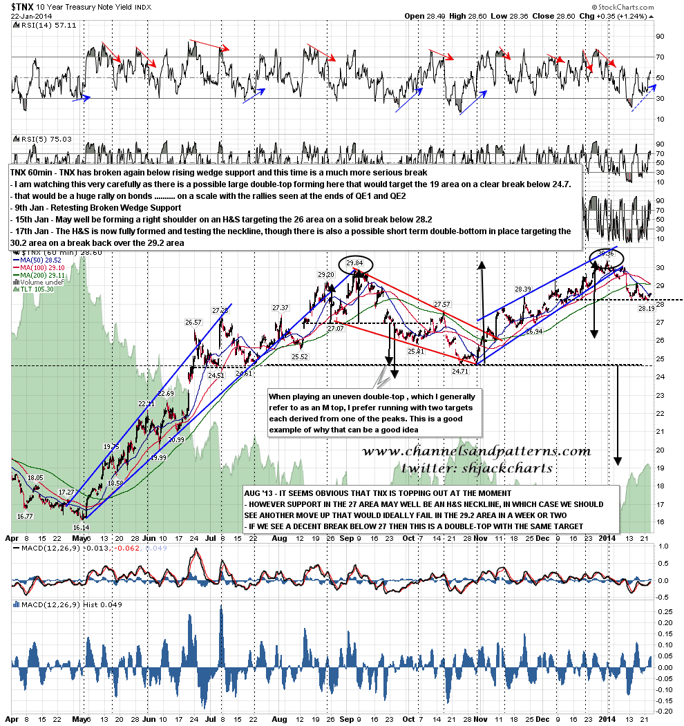 TNX is at a very important inflection point here, having completed an H&S looking towards 26, and having also formed a possible double-bottom (on positive 60min RSI divergence) targeting the 2014 highs on a clear break over 29.2. TNX 60min chart: