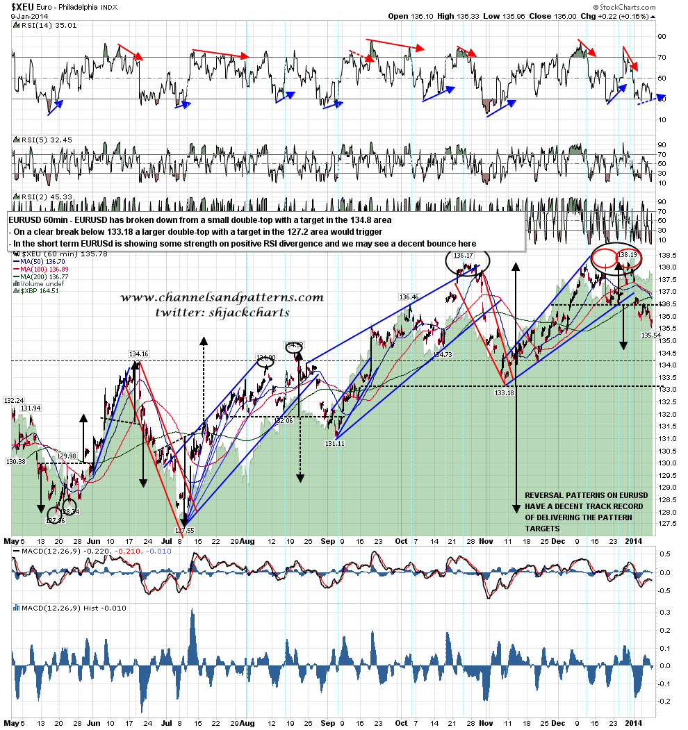 EURUSD is still some distance short of the 134.8 double-top target I gave on Tuesday morning, but is showing some strength this morning, backed up by some positive RSI divergence at the close yesterday. We could see a decent bounce here, most likely to establish a less steep declining resistance trendline. EURUSD 60min chart: