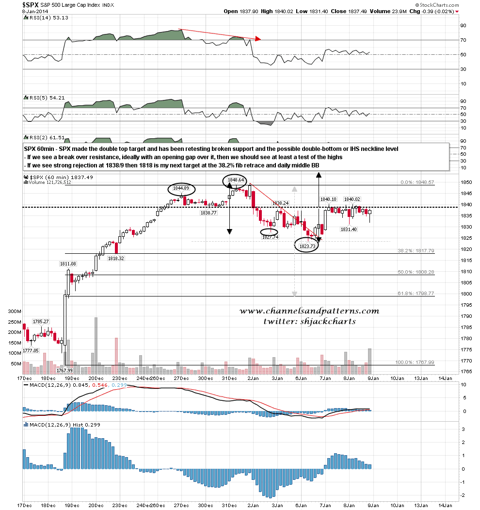 Direction was hard to call yesterday morning, and as it turned out, SPX went nowhere, though COMPQ, NDX and TRAN all managed solid gains on the day. The W bottom on SPX is now arguably an IHS and if we see a clear break over the neckline today, ideally with an opening gap over it which is not then filled today, then we should see at least a retest of the highs. SPX 60min chart: