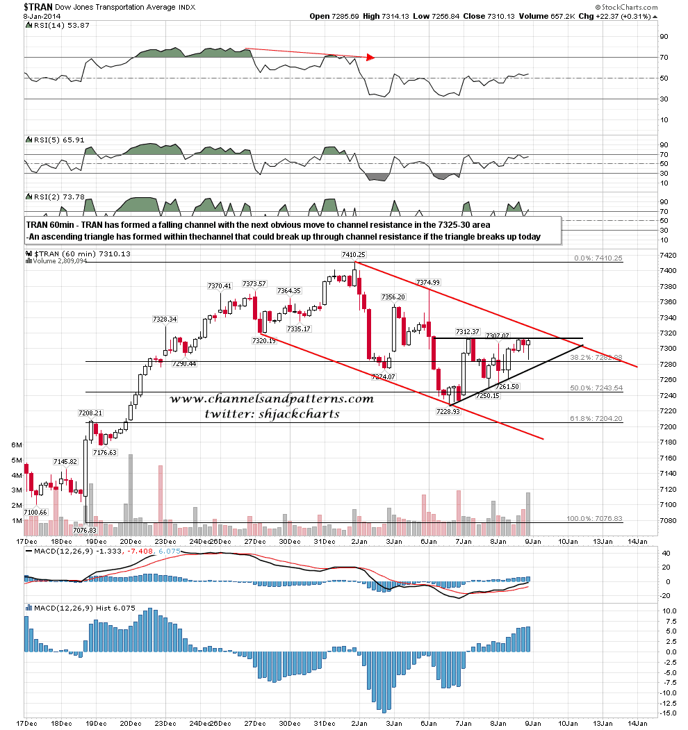 Of the other indices that I was looking at yesterday morning, TRAN is probably going to give the best clues as to direction. TRAN is returning to test falling channel resistance, currently in the 7325-30 area, and channel resistance will decline to current resistance in the 7312 area by the end of today. If we don’t see a break upwards through channel resistance today, then that would favor the bears somewhat tomorrow. an ascending triangle has formed during the current move upwards, and while these are mediocre performers on a break up, a clear break above triangle resistance could give TRAN a boost to to break over channel resistance: TRAN 60min chart: