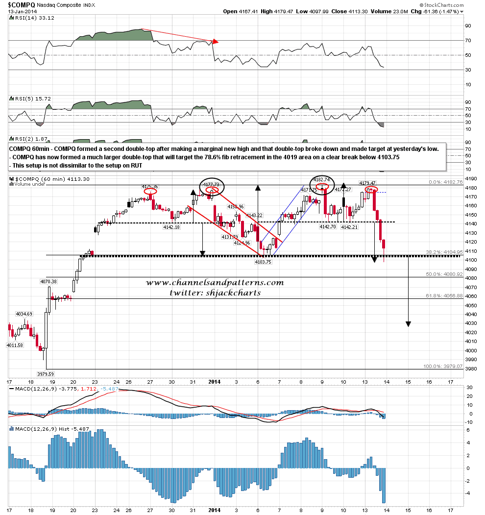 There are other reasons to think that the retracement may be deeper however, and that is because there are other double-tops that have formed and not yet broken down yet. If they do break down then the targets wouldn’t be a good fit with a marginal new low on SPX. Here’s the one on RUT, which I have also marked up as a possible megaphone, though it makes a much better double-top. RUT 60min chart:
