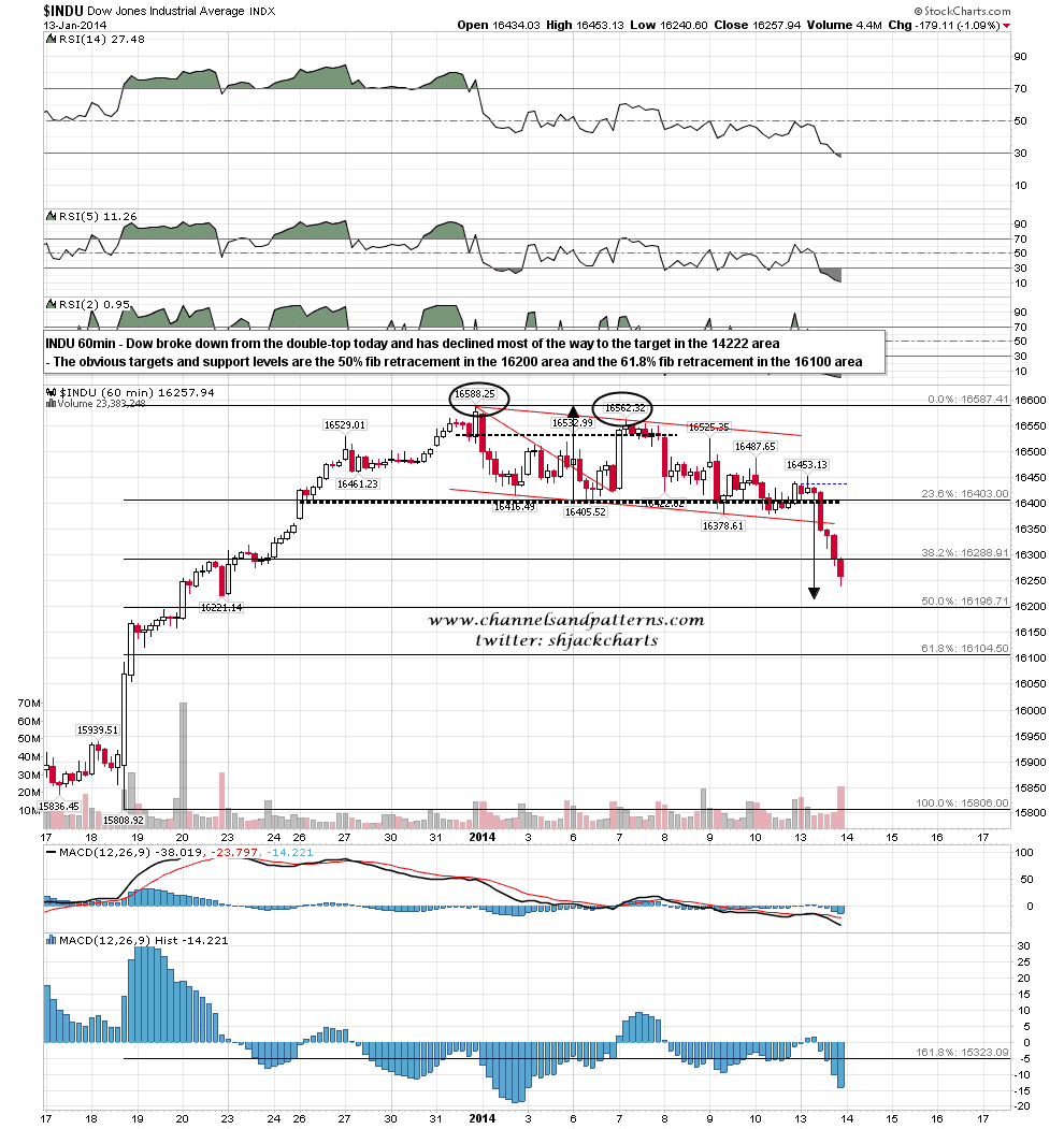 The double-top on SPX has a lot of support on other indices. The double-top on Dow had been testing the valley low area for days and also broke down hard. Dow 60min chart: