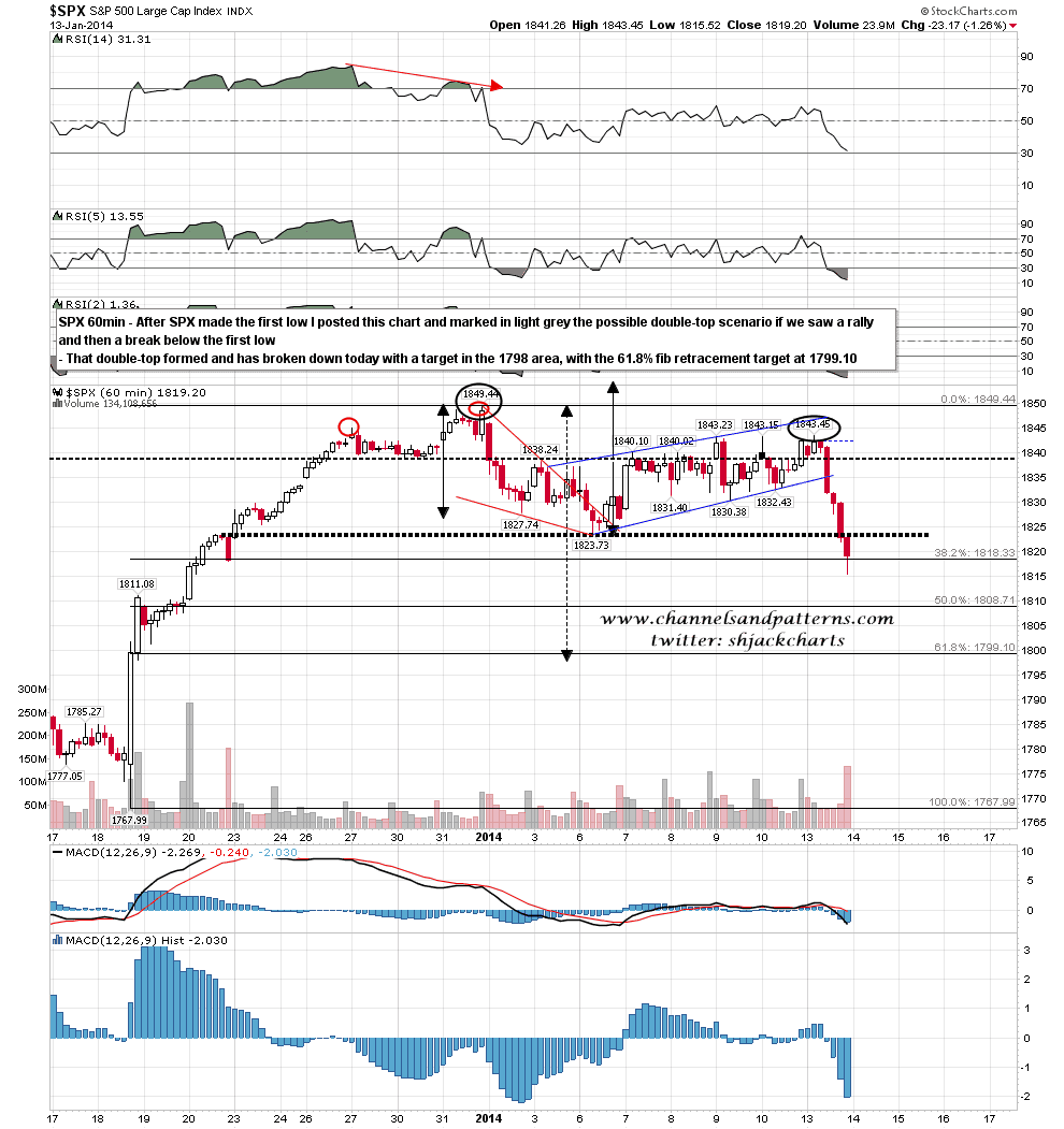 Last Wednesday I posted an SPX chart looking for a retest of the highs and sketched in very light grey a scenario where SPX made the second high of a double-top which would then break down with a target near the 61.8% fib retracement at 1799. The second high of that double-top peaked yesterday and it broke down with conviction with a target at 1798, and a possible alternate target at 1804 (due to the second high being six points lower). SPX 60min chart: