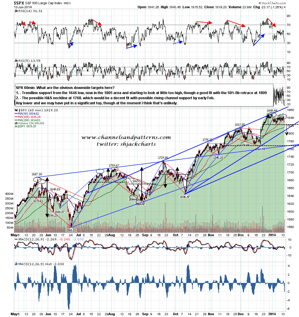 So what are the obvious trendline targets here? Rising support from the 1646 low is the best trendline target, and that is now in the 1805 area. That is perhaps looking a little high now. I have another target area in the 1790s which isn’t a trendline target and the next is a retest of the 1768 low. That would be a fit with either of two trendline targets marked below in early February. SPX 60min trendlines chart: