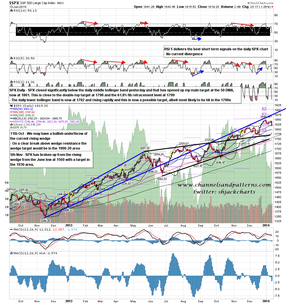 If support in the 1790s doesn’t hold, then the retest of the 1768 low and test of the possible H&S neckline there would be a decent fit with the SPX weekly middle bollinger band, currently at 1765, and likely to be over 1768 by the end of the week. Why am I thinking that SPX might retrace this far? Well I posted some stats on the aftermath of punches over the weekly upper bollinger band on 19th November , which you can see here. On the basis of those stats it would be reasonable to expect this retracement to retrace between 3.5% and 4.5%, which would be to a target in the 1766-84 range. Just something to be borne in mind, though SPX may well reverse back up at trendline support at 1805. If not however ……..SPX weekly chart: