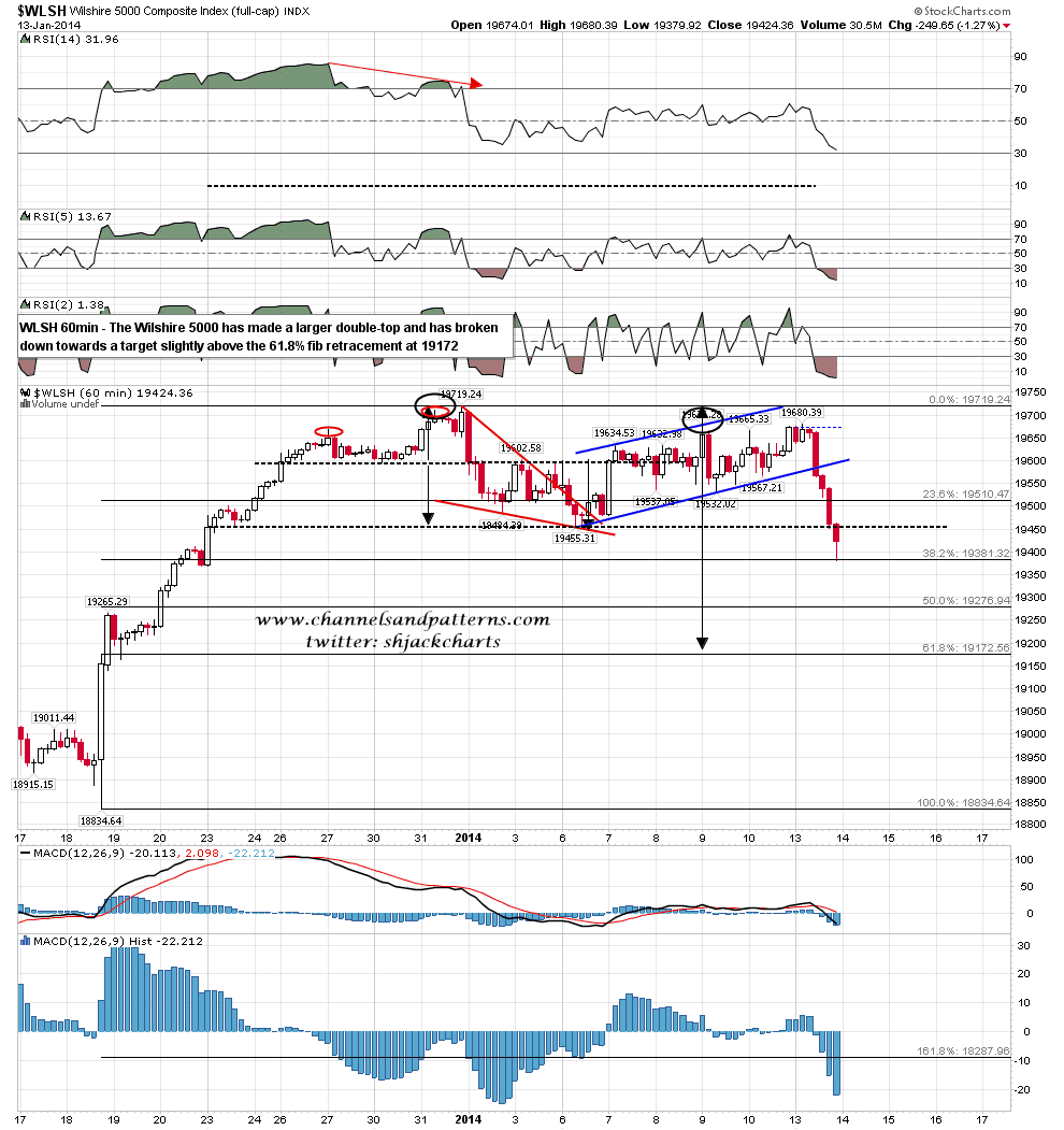 The broadest US index, the Wilshire 5000, tells the same story and none of these indices has either reached target or developed significant positive divergence, so the low yesterday is unlikely to be a final retracement low. WLSH 60min chart: