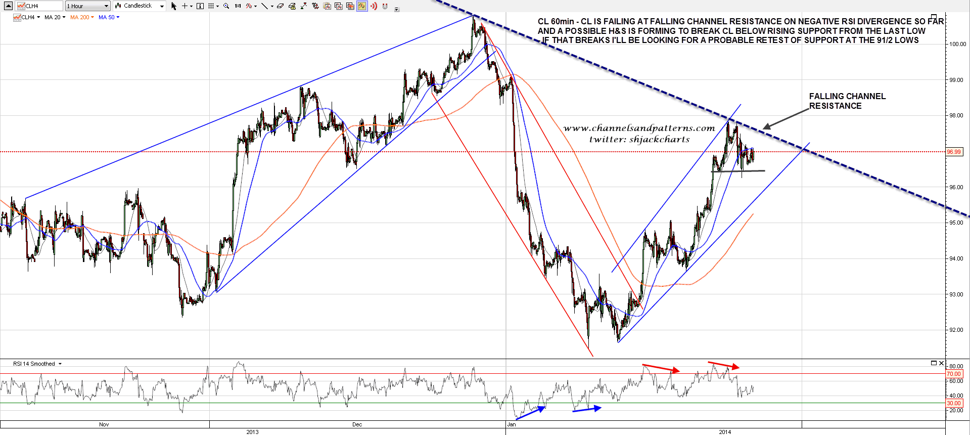 On the CL 60min chart the reversal at declining channel resistance was on decent negative 60min RSI divergence. A rough H&S may be forming to punch CL down through rising support from the last low. If that happens I’ll be looking for a likely retest of 91/2 area support. CL 60min chart: