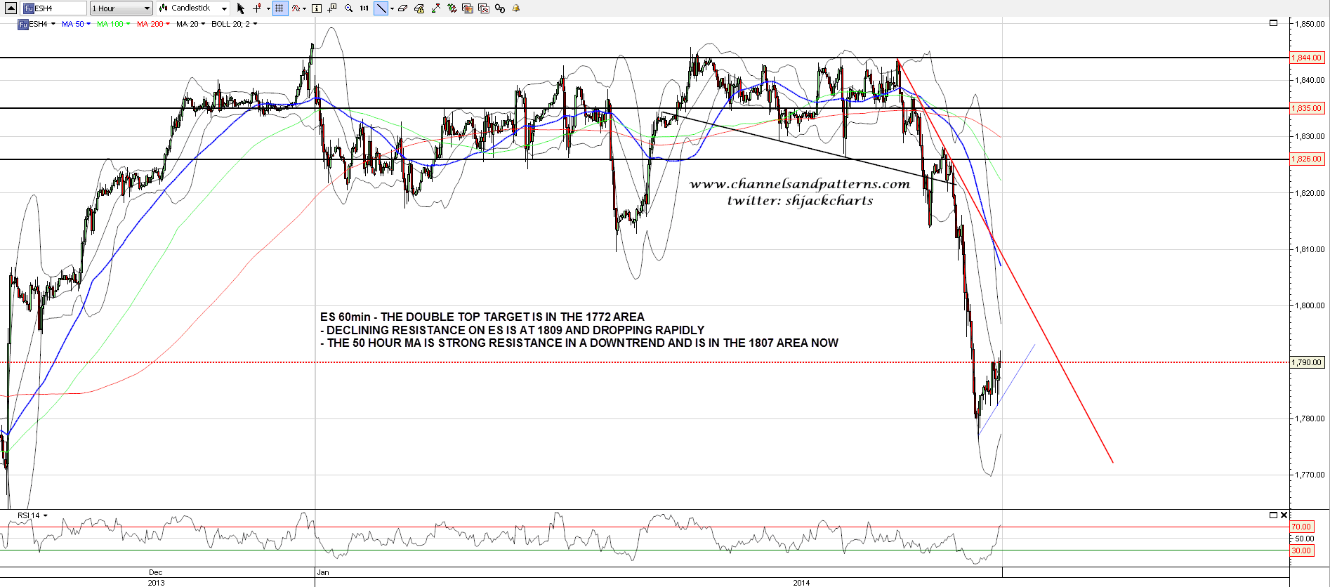 ES is bouncing at the moment, and I’m expecting the bounce to go further, but it will top out today or possibly tomorrow and then turn back down, so if you went long near the close on Friday don’t stay in the trade too long. The resistance levels that spring to the eye on ES are declining resistance in the 1809 area (and declining very rapidly) and the 50 hour MA in the 1807 area. I’m expecting the ES daily lower bollinger band to end the day in the 1795-1800 range, and I’m expecting this bounce to top out somewhere in the 1795-1805 ES range. ES 60min chart: