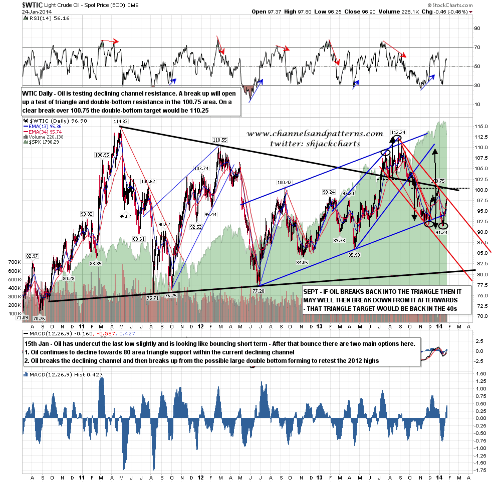 On other markets I’ll just look at oil today, as that is at the most immediate inflection point. On 15th Jan I gave the key inflection point for oil at declining channel resistance and that was tested at the high last week. If oil breaks up through then the pattern setup starts to look impressively bullish. If it breaks down we could be at the start of a major decline, with the next support levels at declining channel support, now at 86, and overall triangle support, now in the 80.5 area. On a break below triangle support the triangle target would be in the 45/6 area, with my long term support trendline from the 1998 low in the ………….. 45/6 area. Just sayin’. WTIC daily chart: