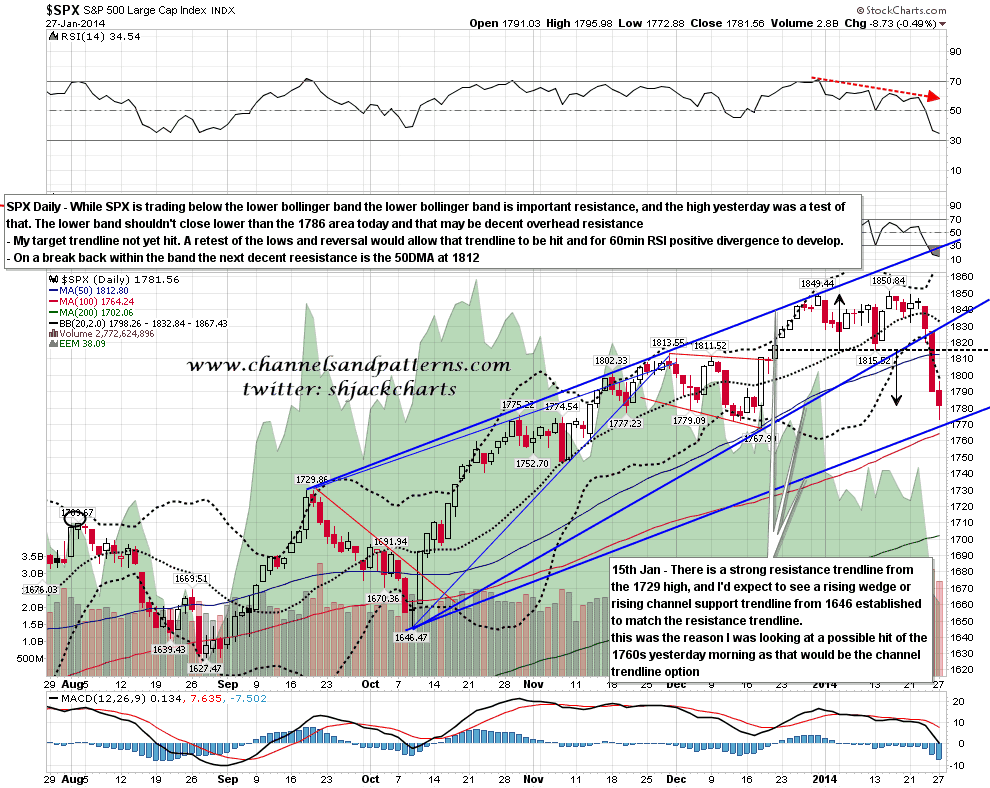 SPX has been trading entirely under the daily lower bollinger band since the break below on Friday. resistance yesterday was at a retest of the lower bollinger band and that may be the case again today. if so then i am not expecting the SPX daily lower BB to close much below 1788 SPX and that would be a resistance level to watch. On a break back above the next serious resistance is at the 50 DMA in the 1812 area.