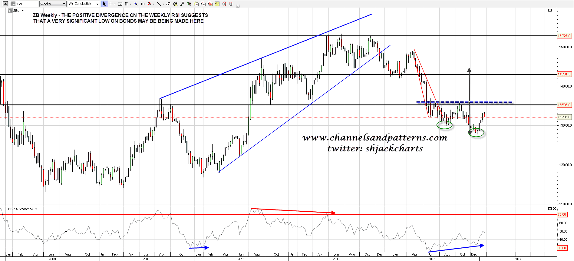 I’ve been considering the case for a big rally on bonds starting at the moment and there is strongly positive divergence on the ZB weekly RSI. There is a part-formed double-bottom there which is equivalent to the double-top forming on TNX. These RSI divergences don’t dictate that these will play out, but they are very supportive. ZB weekly chart: