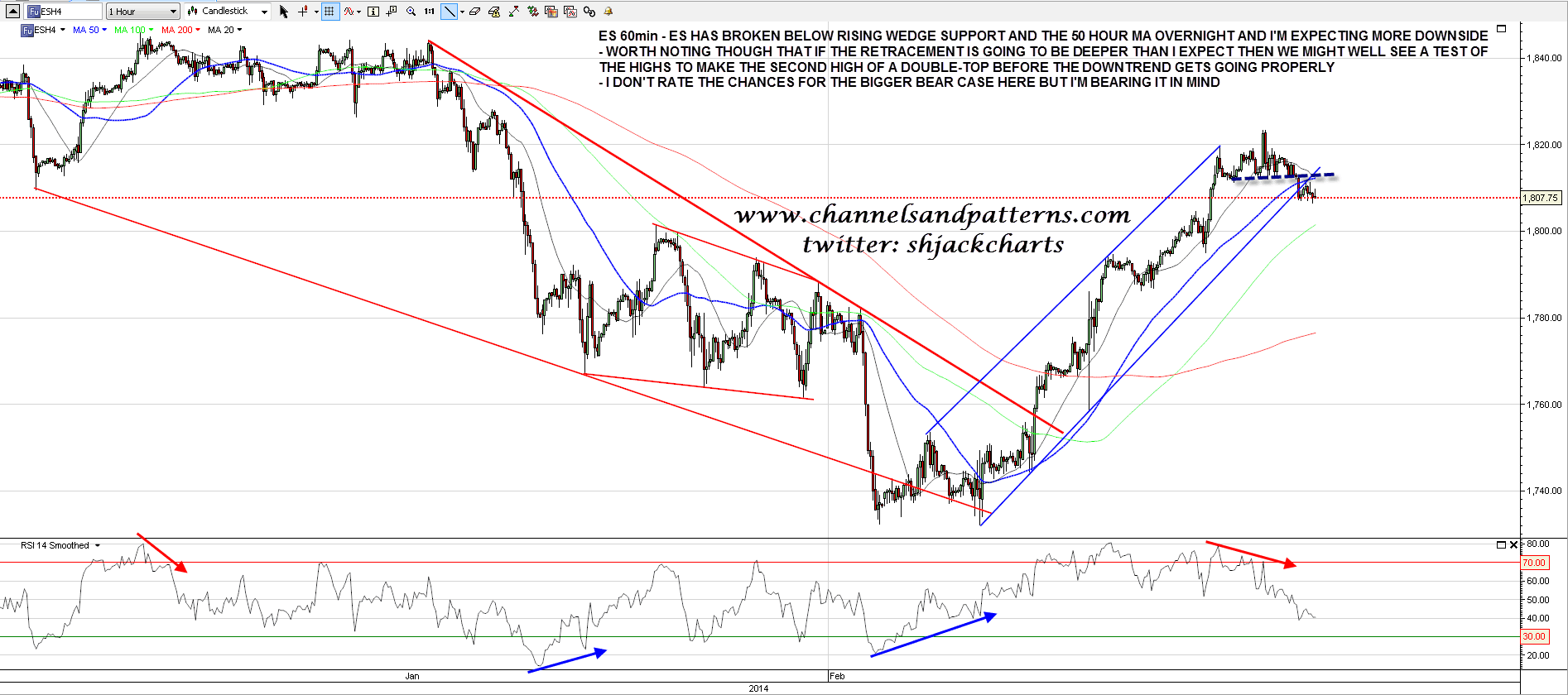 I gave the remaining significant resistance level on ES/SPX in the 1824-8 ES range yesterday and the reversal at 1823.5 was at the bottom of that range. ES has now broken down from both the rising wedge and the 50 hour MA and I’m expecting more downside, though I would add the caveat that at this stage in a rising wedge breakdown there is often a retest of broken wedge support or a test of the highs to establish the second high of a double-top. We could still see that happen here. ES 60min chart: