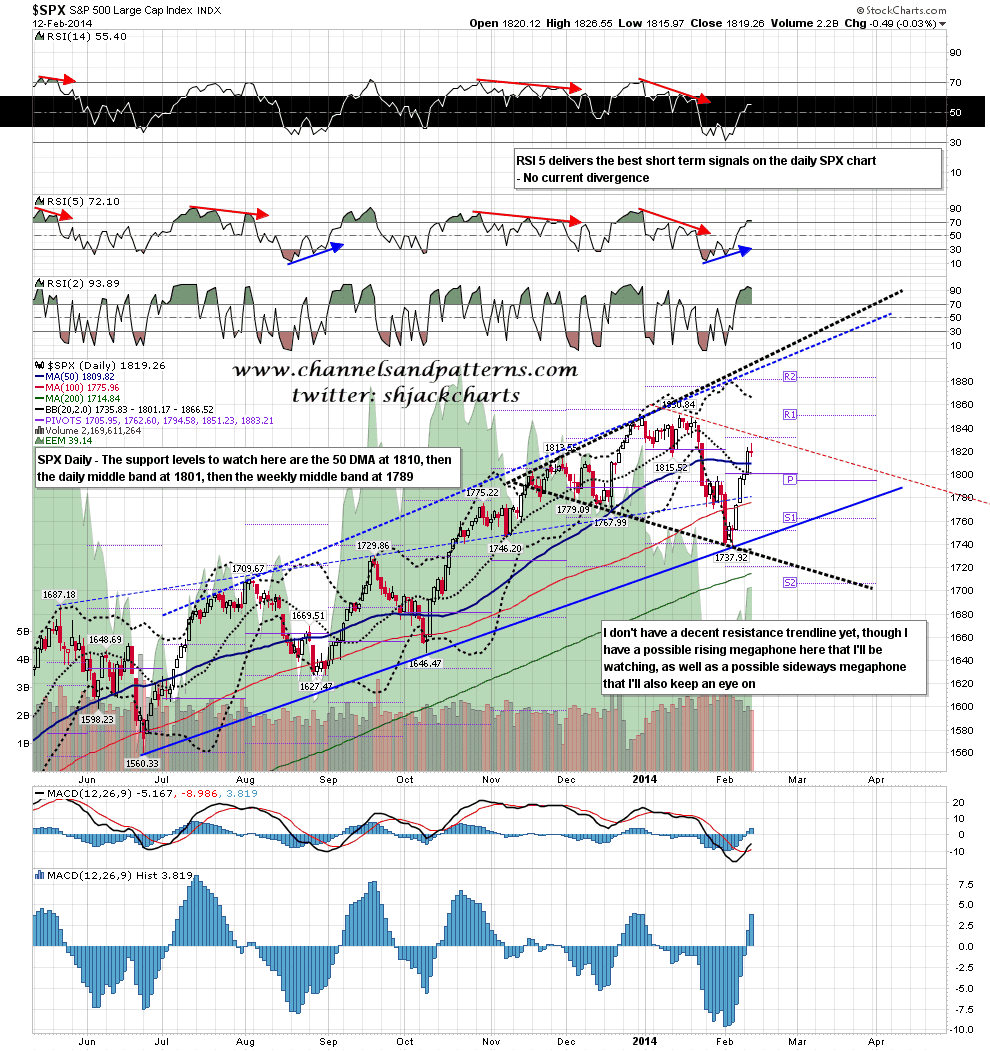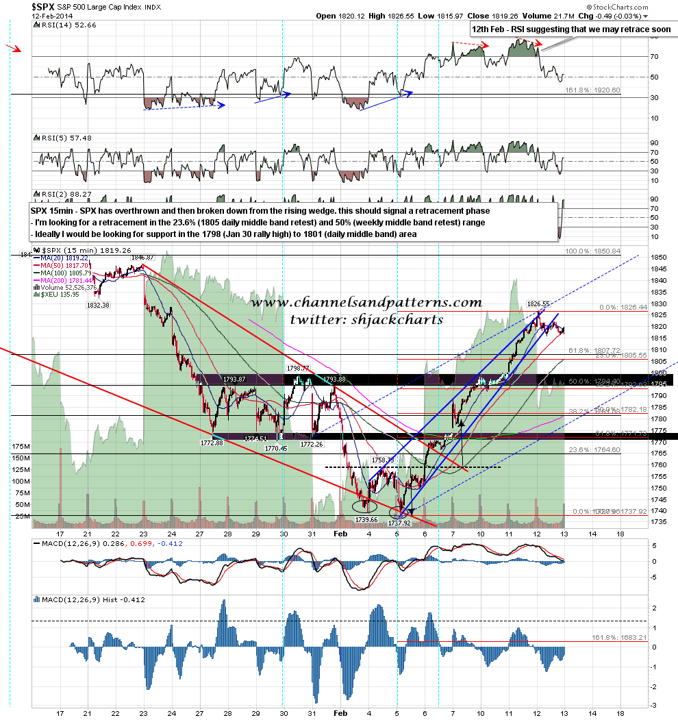The rising wedge on SPX that I showed yesterday morning broke down in the afternoon. I’m looking for a retracement in the 23.6% (1805 just above daily middle band retest) and 50% (1782 weekly middle band retest) range. My ideal target range would be the daily middle band at 1801 SPX down to the 1798 Jan 30 high. The weekly middle band is at 1789 but history suggests that will most likely not be retested. SPX 15min chart: