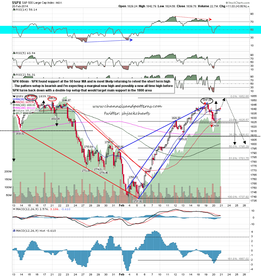 I was saying yesterday morning that an hourly close much over the ES 50 hour MA at 1830.5 would suggest a retest of the highs, and well here we are. There are two options here and the first, and my preferred option, is that we are going to see the second high of a short term double-top made here. The second is that after a very minimalist retracement we are starting a new move up.
