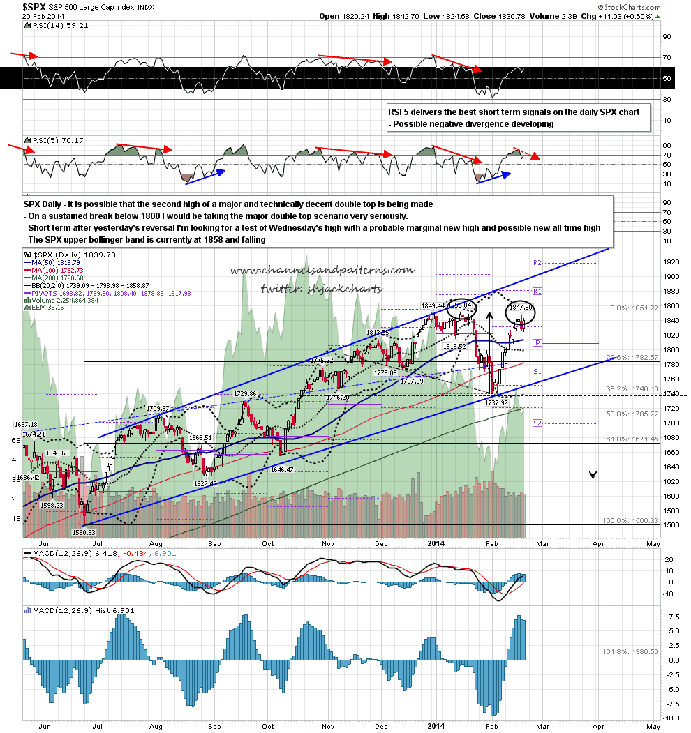 So where would this second high of a double-top top out? I’d expect a higher high than Wednesday’s 1847.50 SPX, and very possibly a new all time high over 1850.84. Firm resistance is at the daily upper bollinger band now at 1859 (and still falling), and I would count anything at 1852/3 or above as a technical hit of that resistance. The obvious time to see that higher high made would be today or Monday. If we do see this higher high made that would be with negative divergence on the daily RSI 5, which is my preferred reversal indicator at a reversal of any decent magnitude. SPX daily chart: