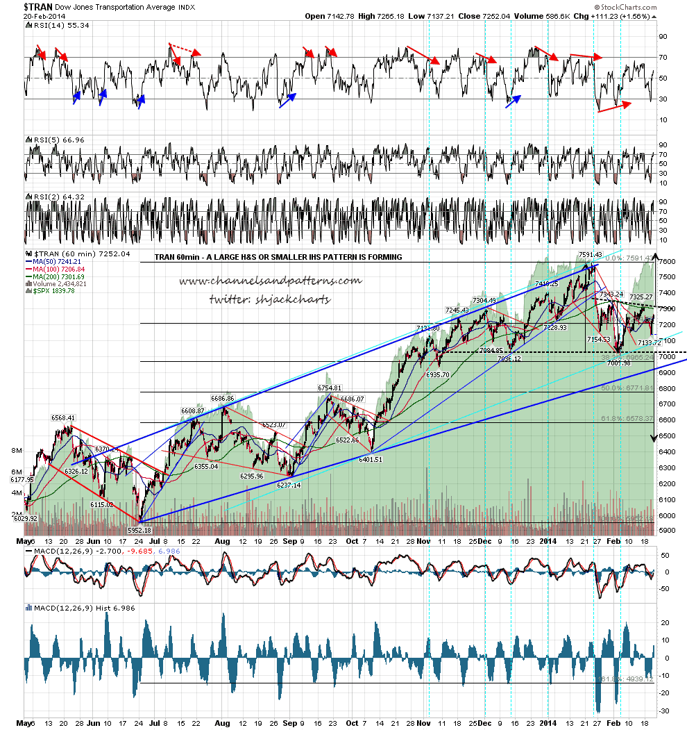 One chart I’ll be watching here is the TRAN chart, which captures the ambiguous direction here well and may well be a good indicator for which way this breaks. On TRAN we have a large H&S forming and an obvious next target at rising support from the June low, which favors the bears here, but a possible smaller downsloping IHS is also forming, which would favor the bulls if it breaks up. If we see a sustained break up over that TRAN IHS neckline then that would strongly favor the bullish view that the low yesterday was the low for the (unexpectedly shallow) retracement that I have been looking for here. TRAN 60min chart:
