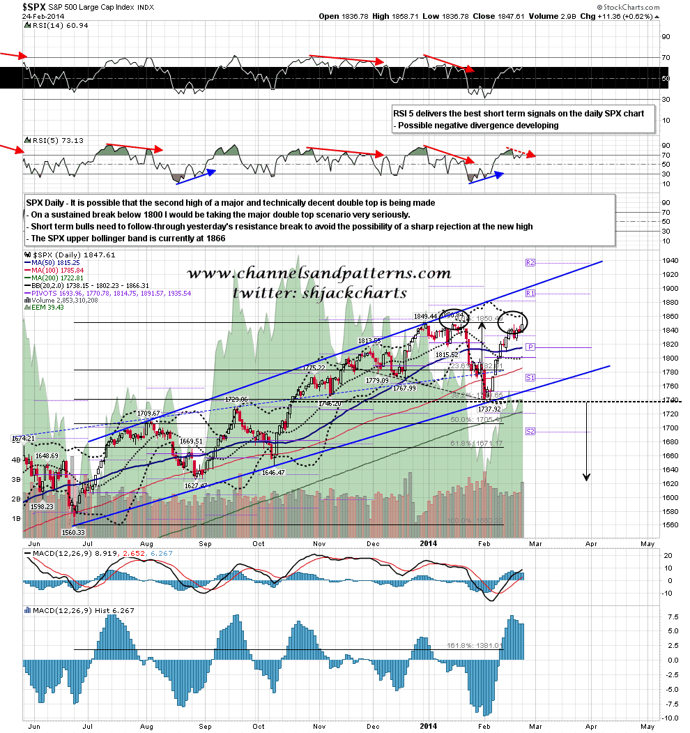 If we are to see a faster move up however we would need to see some retracement or consolidation soon to make some room for that move, and there is now clear short term negative divergence on the daily RSI 5 and the 60min RSI 14. We could see that retracement/consolidation from yesterday’s high, or we could see a higher high to test the daily and weekly upper bands in the 1866 area, but one way or another we should see it soon. Here is the SPX daily chart showing the negative RSI 5 divergence and the possible major double-top forming that I would start to consider seriously only on a break under 1800 area support. SPX daily chart: