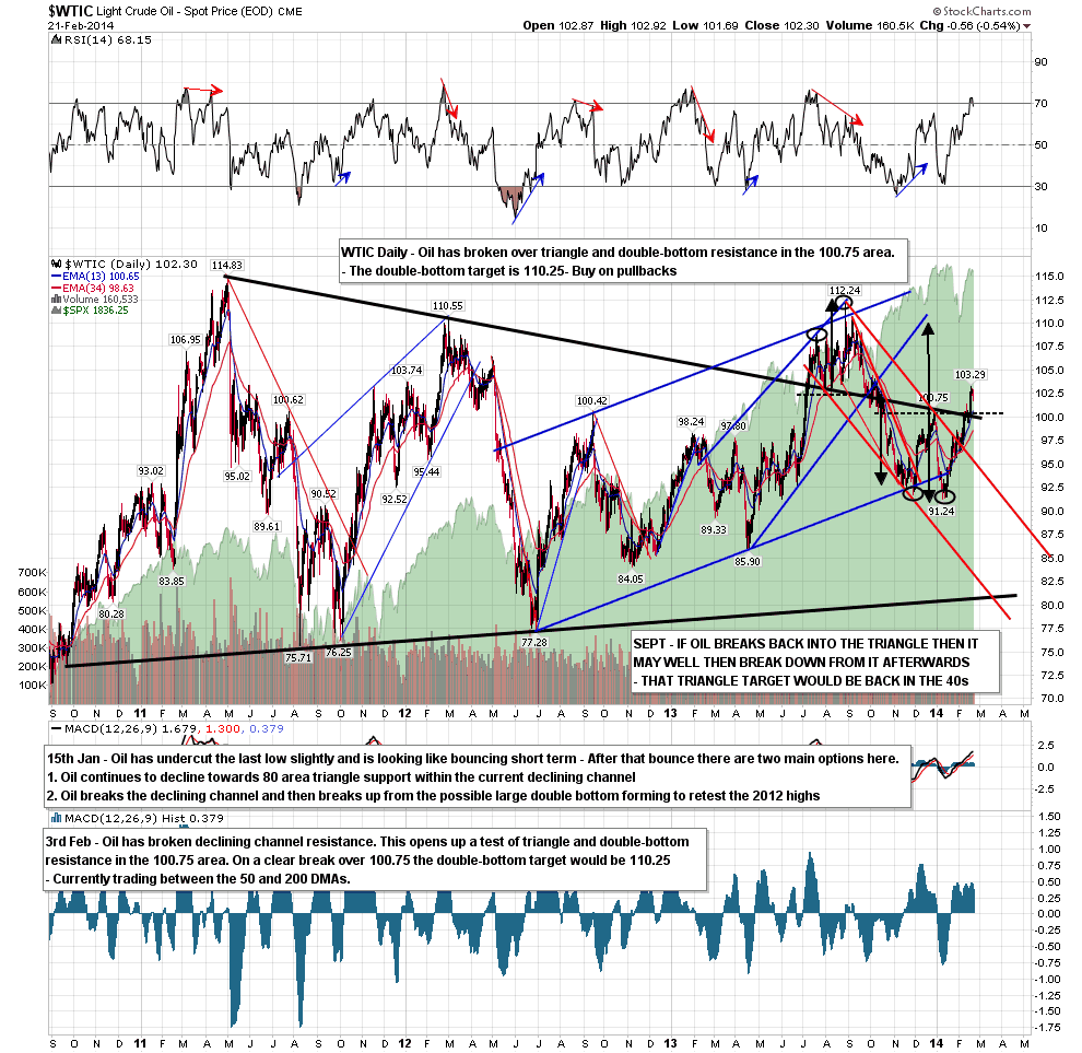 Last chart for today is the oil chart, where on the WTIC daily chart oil has broken up hard from a double-bottom with a target in the 110.25 area. Again this is a strong setup and is a buy on pullbacks until that target area has been reached. WTIC daily chart: