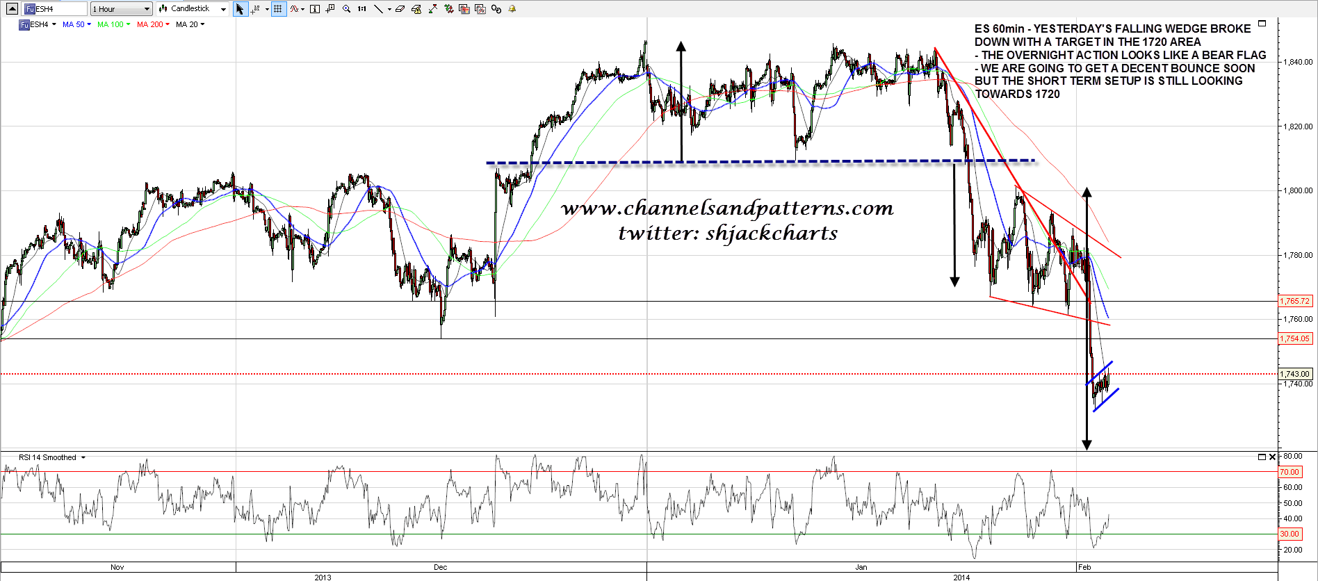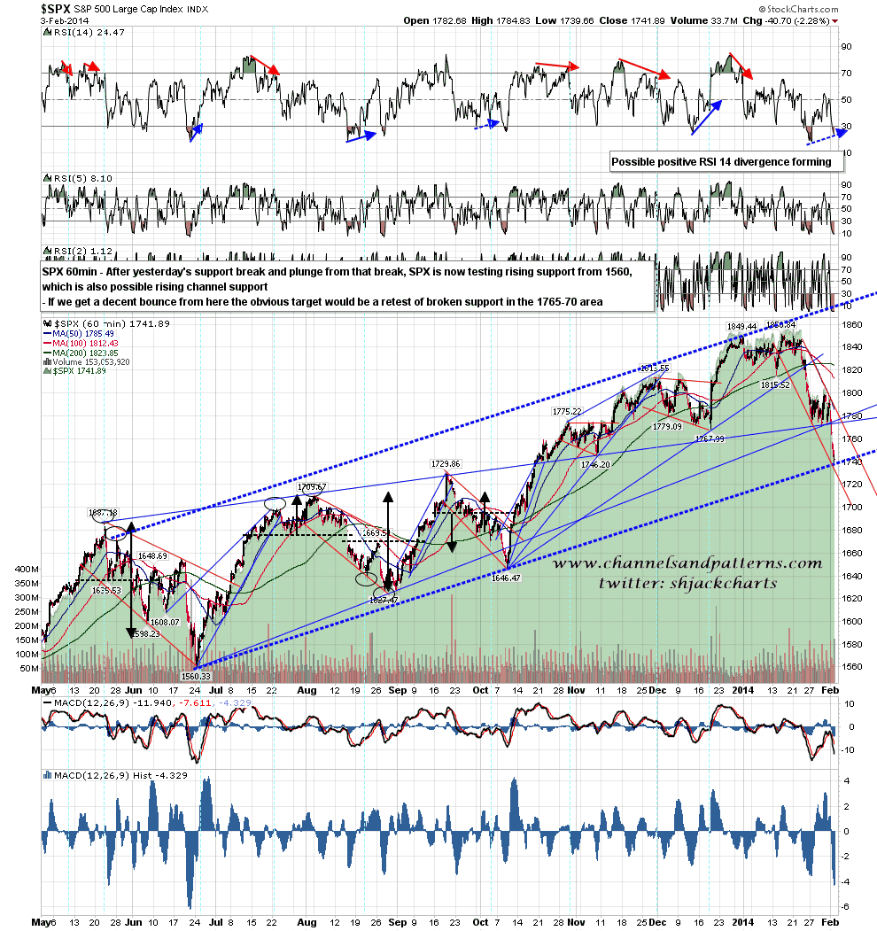 Well I said yesterday morning that the day was going to be a very important test for bulls and so it was, with a massive bull fail as strong support in the 1770 SPX area broke and SPX fell very hard towards the next big support levels. I posted a falling wedge on ES yesterday morning and that broke down with a target in the 1720 ES area. The overnight rally looks a lot like a bear flag so it may be that we are going to see that 1720 target made today. ES 60min chart:
