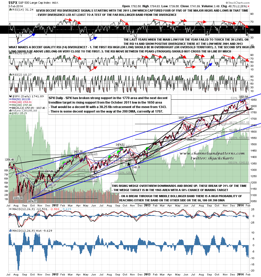 Assuming that rising support from the 1560 low doesn’t hold, what are the next important support areas? The first is the 200 DMA, now at 1707. The 200 DMA is an important support level and is well overdue a hit, as it wasn’t tested in 2013. Below that is rising (poss channel) support from 1074 SPX in the 1645-50 area. With the 38.2% fib retracement of the move up from 1343 in the 1657 area that is a target that I’m considering here. SPX Daily chart: