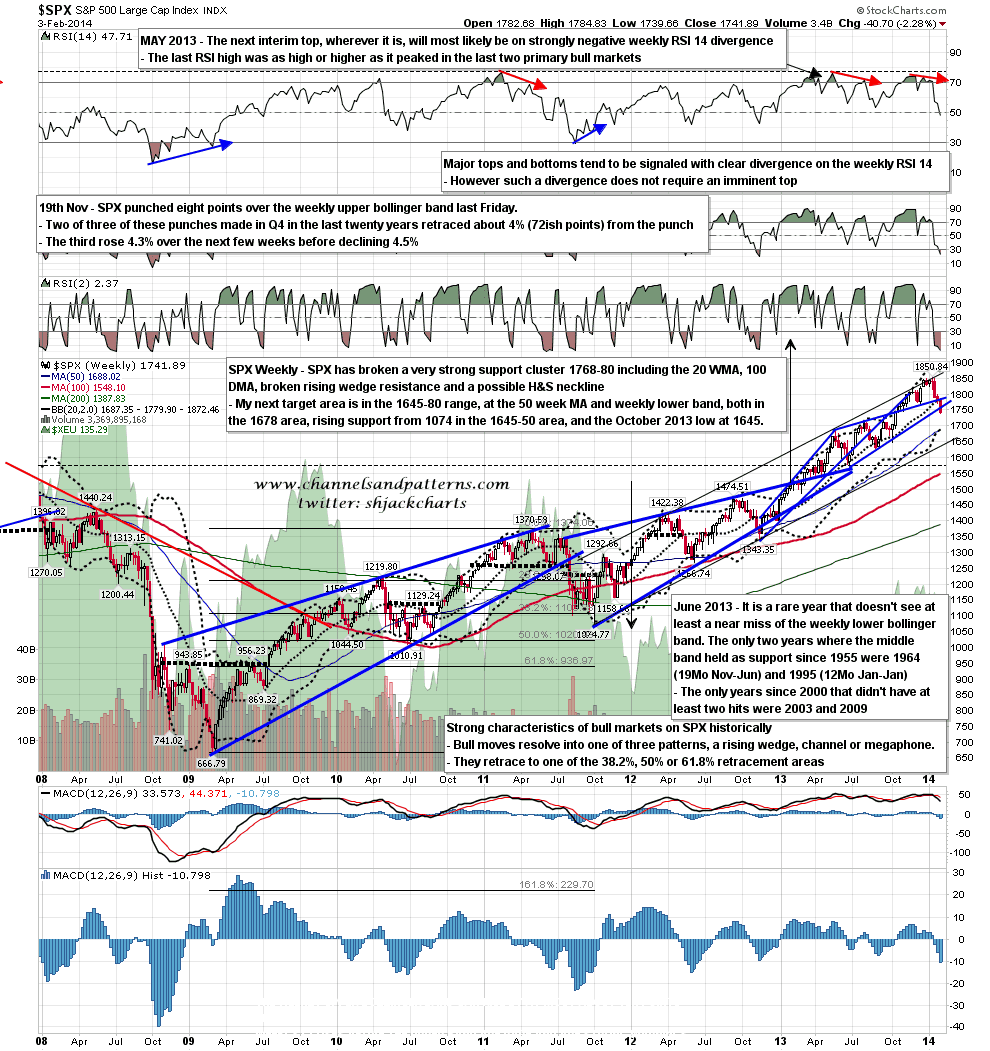On the SPX weekly chart the next important level is in the 1678 area, at both the 50 week MA and the weekly lower bollinger band. Again, this would not be a bad fit with a hit of the rising support trendline from 1074, and also with a test of the October 2013 low at 1645. SPX Weekly chart: