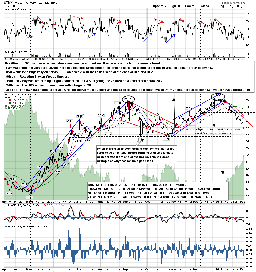 TNX made the 26 target for the H&S yesterday, and has dampened though not eliminated the positive RSI divergence that I was looking at yesterday. What happens next is very important as there is a major possible double-top trigger level at 24.71, and it TNX breaks and holds below that the double-top target would be 19. As I’ve mentioned before that would not be out of line with previous bonds rallies at the end of QE periods. TNX 60min chart: