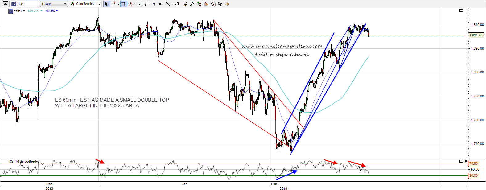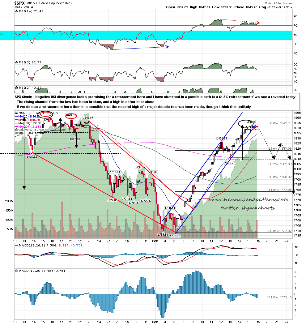 We might see a last move up today to test the 1851 SPX high but we may well have already topped yesterday. If a retracement is starting then I have the key support areas at 1815-8 for the 23.6% fib retracement and the retest of the 50 DMA, the possible H&S neckline at 1809, and 1800-3 for the 38.2% fib and the retest of the SPX daily middle bollinger band. If we see SPX break back below 1800 with any conviction then I will start seriously considering the major double-top scenario with a target at 1625 on a sustained break below the last low at 1737.