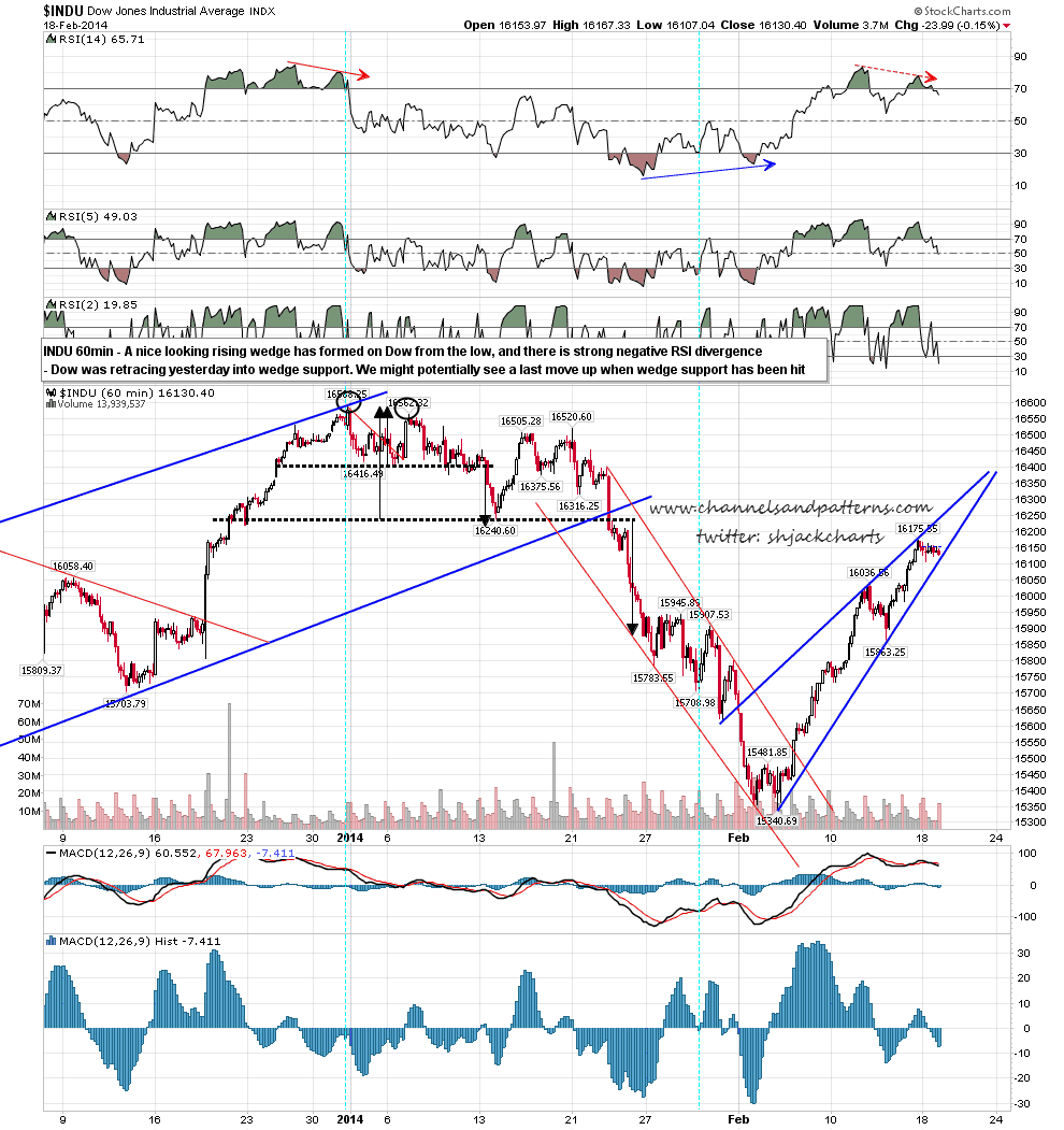 What hasn’t yet broken down is the rising wedge on Dow, though unless there is a significant recovery into the open that is likely to gap under wedge support then. Dow 60min chart: